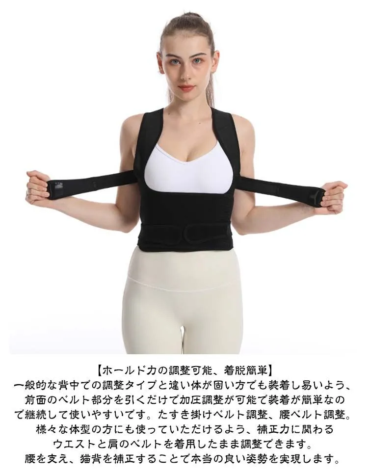 【ホールド力の調整可能、着脱簡単】一般的な背中での調整タイプと違い体が固い方でも装着し易いよう、前面のベルト部分を引くだけで加圧調整が可能で装着が簡単なので継続して使いやすいです。たすき掛けベルト調整、腰ベルト調整。様々な体型の方にも使っていただけるよう、補正力に関わるウエストと肩のベルトを着用したまま調整できます。腰を支え、猫背を補正することで本当の良い姿勢を実現します。 ・