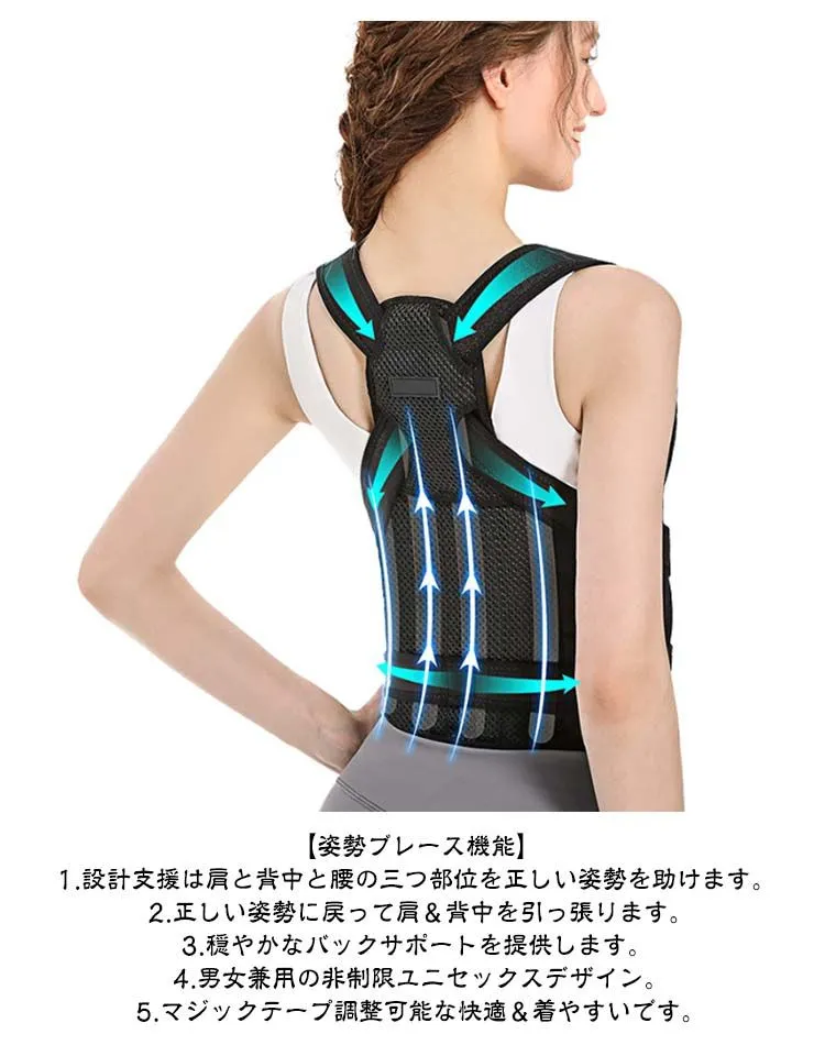 【姿勢ブレース機能】1.設計支援は肩と背中と腰の三つ部位を正しい姿勢を助けます。 2.正しい姿勢に戻って肩&背中を引っ張ります。 3.穏やかなバックサポートを提供します。 4.男女兼用の非制限ユニセックスデザイン。 5.マジックテープ調整可能な快適&着やすいです。 ・