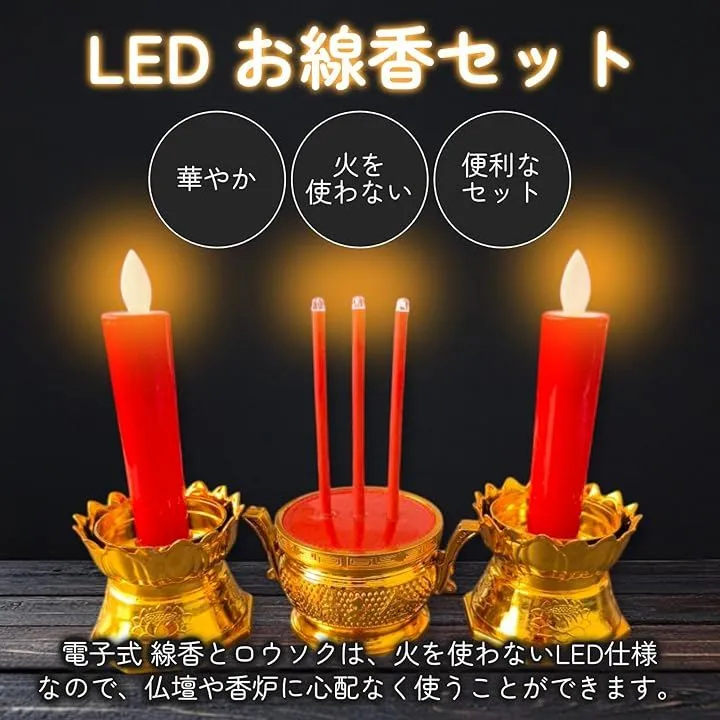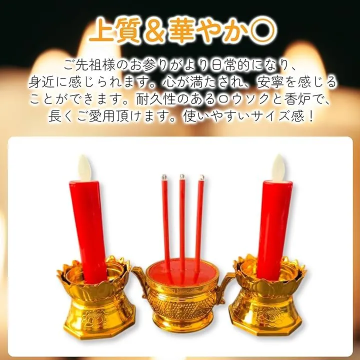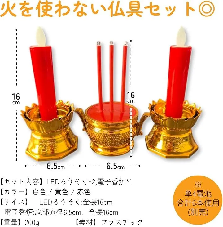 「火を使わない仏具セット」「セット内容」LEDろうそくx2,香炉x1「カラー」白色 黄色 赤色「サイズ」高さ:16cm/14cm 底部・上部の直径:7.5cm「素材」:プラスチック *単4電池6本使用(別売)