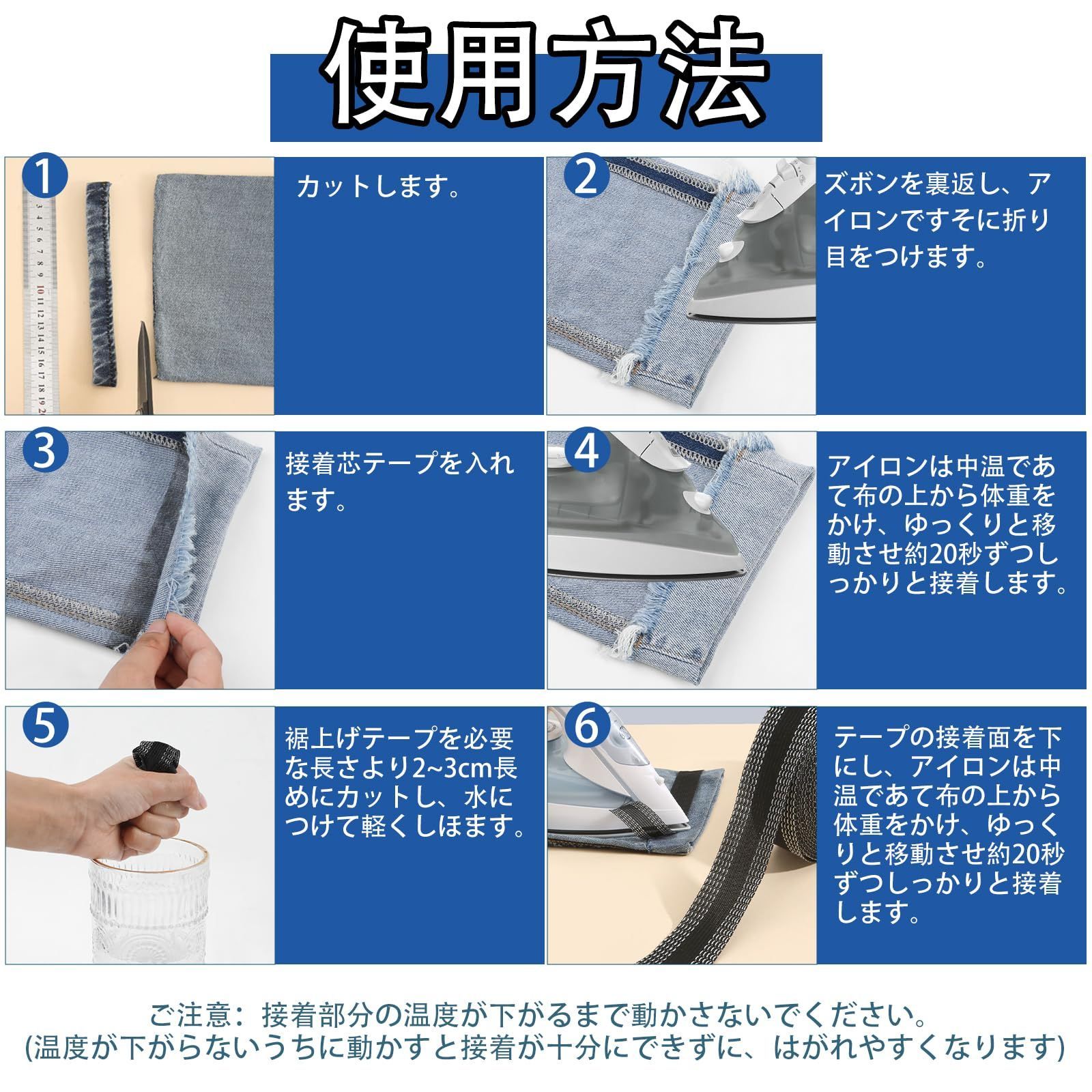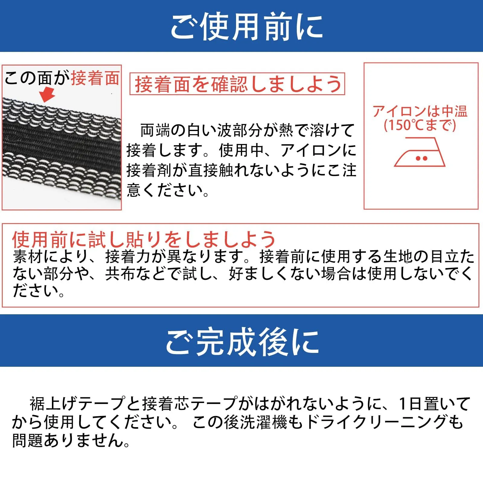 【水洗い可能】: 裾上げテープと接着芯テープがはがれないように、1日置いてから使用してください。 この後洗濯機もドライクリーニングも問題ありません。 シーン:ゆったりしたスカートやカーテンなどの裾上げに便利な、片面タイプのロング裾上げテープです。 使用方法:説明書が付いています。①ズボンを裏返し、アイロンですそに折り目をつけます。②水にぬれた接着芯テープを入れます。(水に濡れると粘性が強くなります。)③アイロンは中温であて布の上から体重をかけ、ゆっくりと移動させ約20秒ずつしっかりと接着します。 ④裾上げテープを必要な長さより2~3cm長めにカットし、水につけて軽くしほます。⑤テープの接着面を下にし、アイロンは中温であて布の上から体重をかけ、ゆっくりと移動させ約20秒ずつしっかりと接着します。※ご注意:接着部分の温度が下がるまで動かさないでください。(温度が下がらないうちに動かすと接着が十分にできずに、はがれやすくなります) 糸も針も不要・便利 他でも販売しているため、お早目の購入をおススメいたします。 どうぞよろしくお願いいたします。