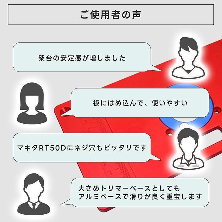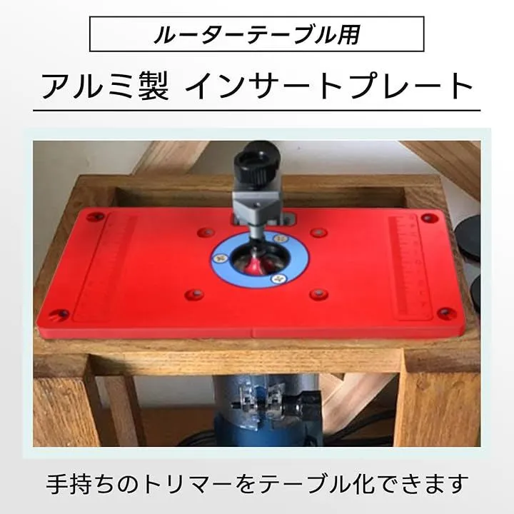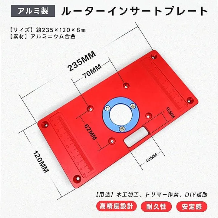 「安定感のあるプレート」「商品内容」アルミ製ルーターインサートプレート「サイズ」約235x120x8mm「素材」アルミニウム合金「用途」木工加工、トリマー作業、DIY補助