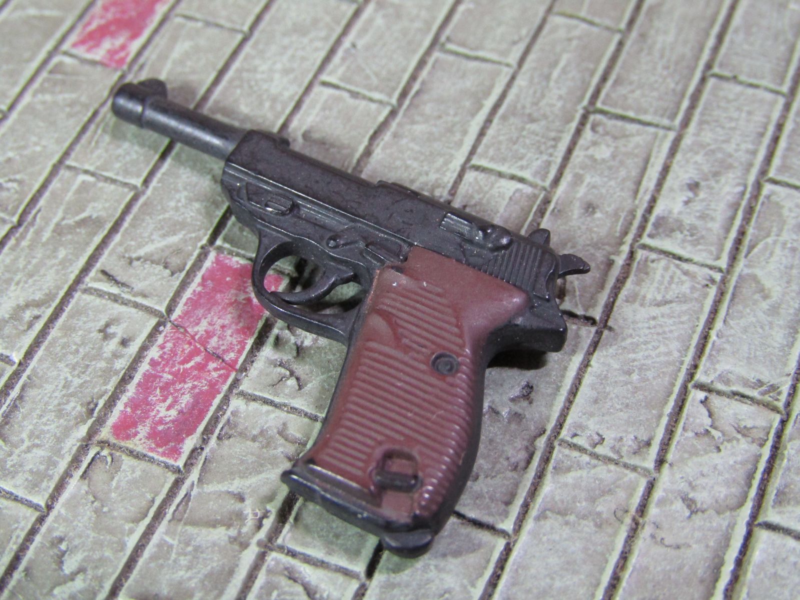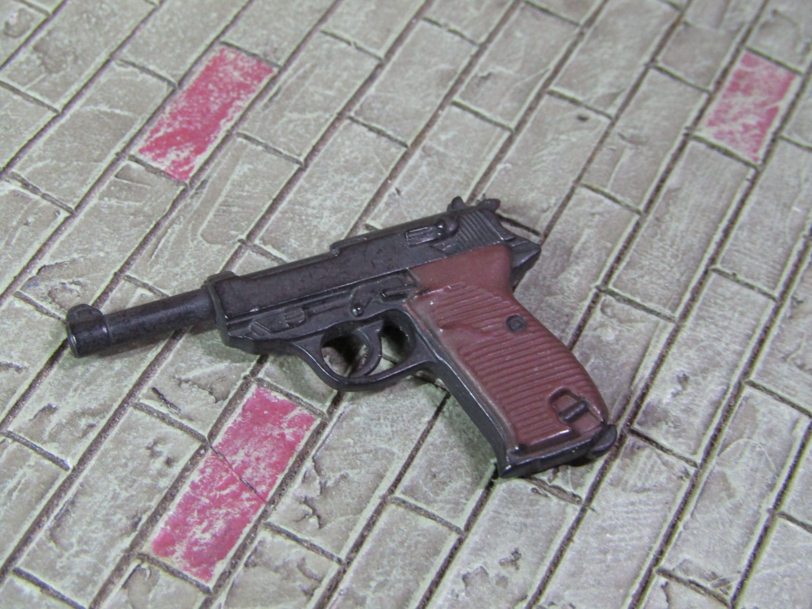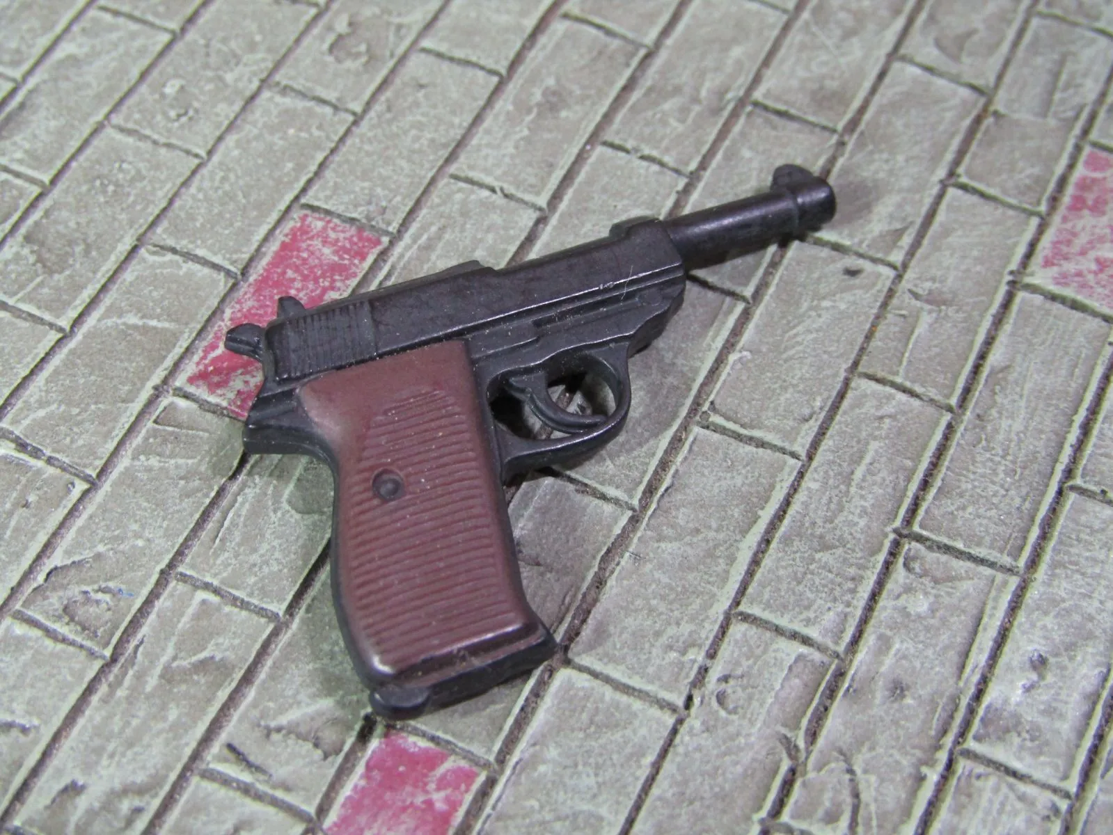 1/6スケール GIジョークールガール用 玩具 WW-Ⅱ ドイツ軍 ワルサーP38 Walther P38 軍用自動拳銃 新品未使用品!でございます。 1/6スケール GIジョー等フィギュア用専用玩具アイテムのルーズパーツでございます。勿論ミニチュア玩具なので弾は発射できませんし、火薬等で使用することもできません。また、可動部分もございません。 ワルサーP38は、第二次世界大戦中はルガーP08と共にドイツ軍によって広く使用され、終戦までに約120万挺が製造された。 大型軍用拳銃としては画期的なダブルアクション機構を組み合わせた自動式拳銃。