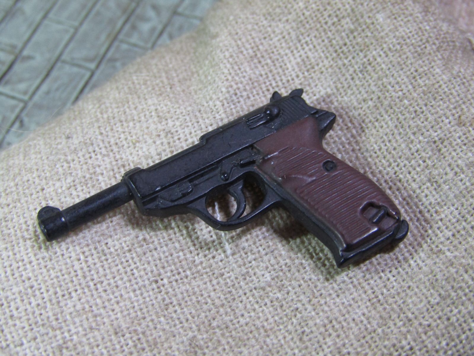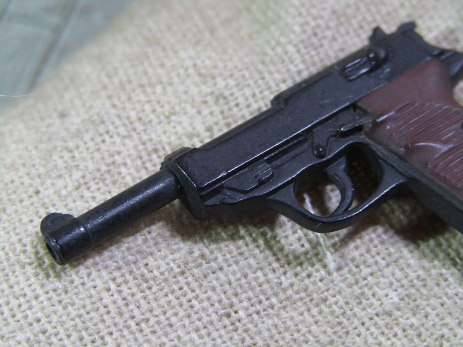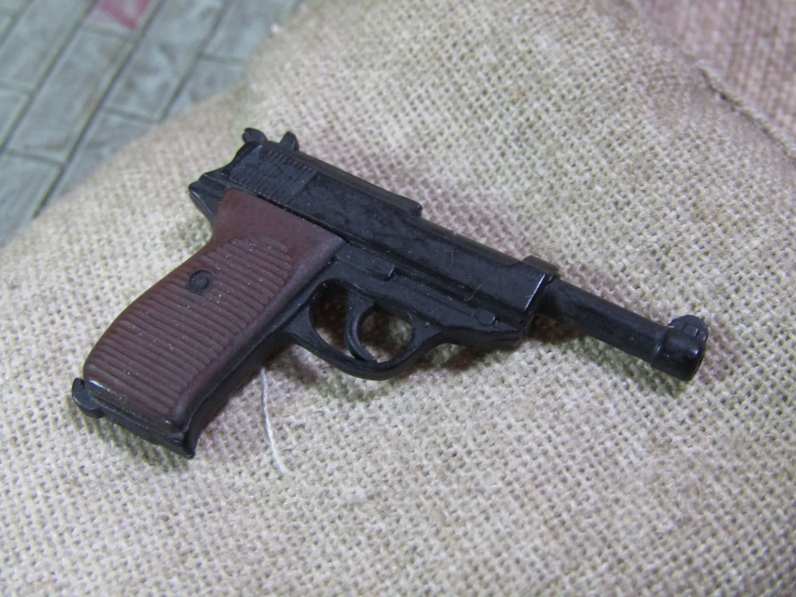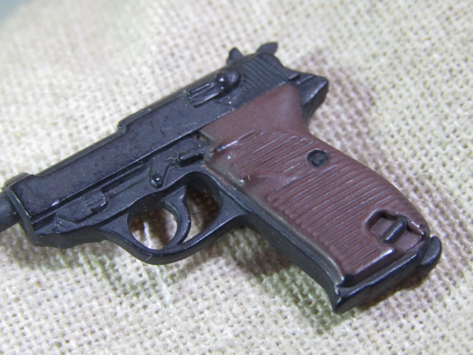 1/6スケール GIジョークールガール用 玩具 WW-Ⅱ ドイツ軍 ワルサーP38 Walther P38 軍用自動拳銃 新品未使用品!でございます。 1/6スケール GIジョー等フィギュア用専用玩具アイテムのルーズパーツでございます。勿論ミニチュア玩具なので弾は発射できませんし、火薬等で使用することもできません。また、可動部分もございません。 ワルサーP38は、第二次世界大戦中はルガーP08と共にドイツ軍によって広く使用され、終戦までに約120万挺が製造された。 大型軍用拳銃としては画期的なダブルアクション機構を組み合わせた自動式拳銃。