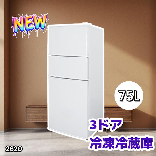 #2620 冷蔵庫 3ドア 75L ホワイト 1人暮らし 小型 ミニ 冷蔵庫 42.3L 冷凍庫 19.5L ソフト冷凍庫 13.2L スリム 幅40cm 丈夫な仕切り ドアポケット 省エネ 7段階調整 ※一部地域離島別途配送料有