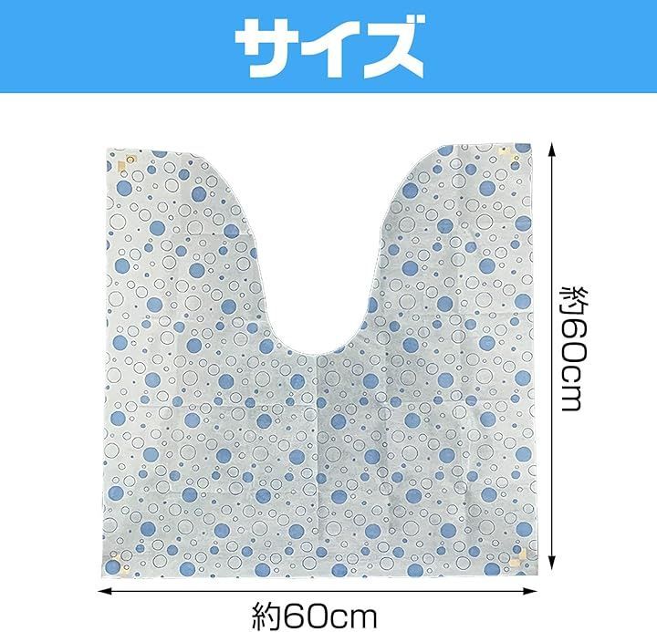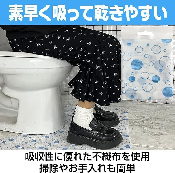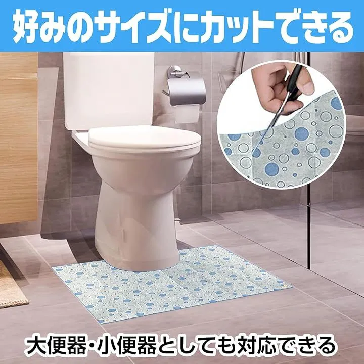この使い捨てトイレマットなら、60cmx60cmのU字型設計で便器周りをしっかりカバーし、飛び散りをキャッチします。