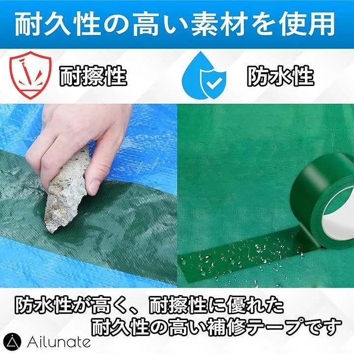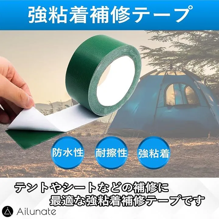 「高い防水性で水に強い」防水性の高い素材を使用しており、雨や水に強く、テントやタープなど屋外で使うアイテムの補修にも最適です。