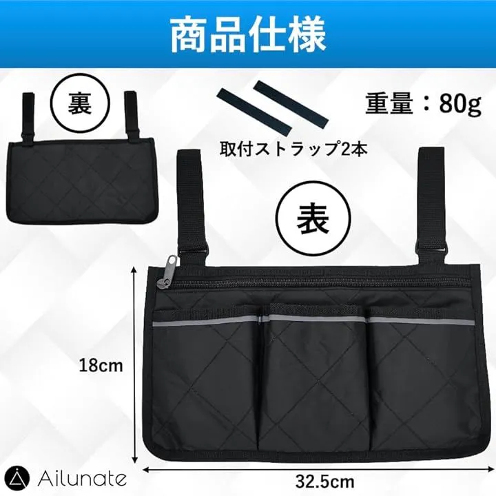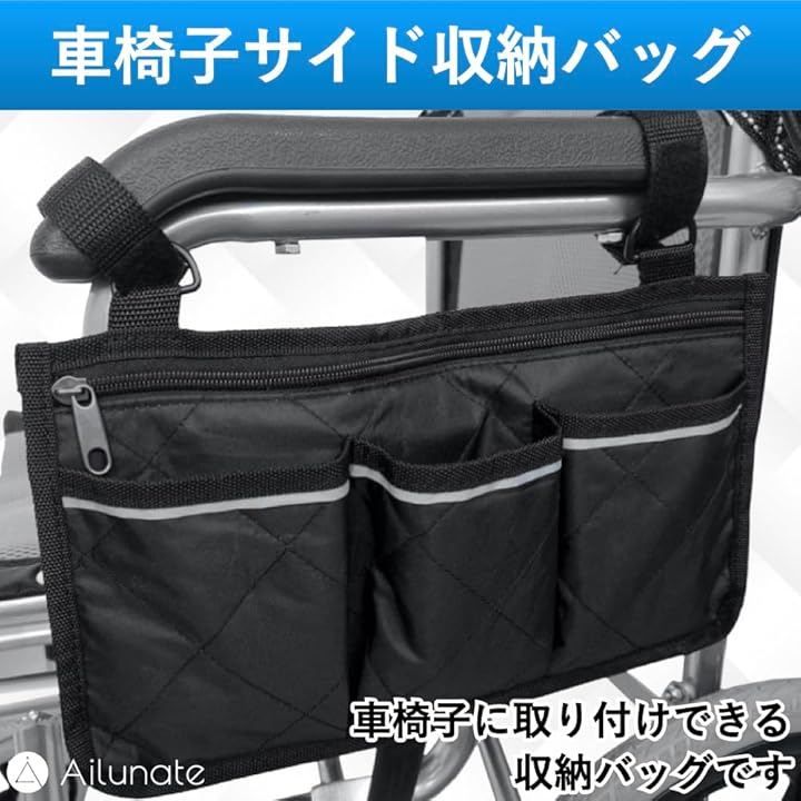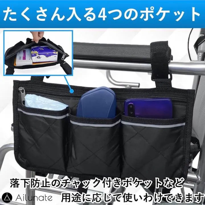 Ailunate 車椅子 サイド 収納袋 バッグ ポケット ポーチ ホルダー 車いす かばん カバー 車イス 小物入れ スマホ アームレスト (ブラック)