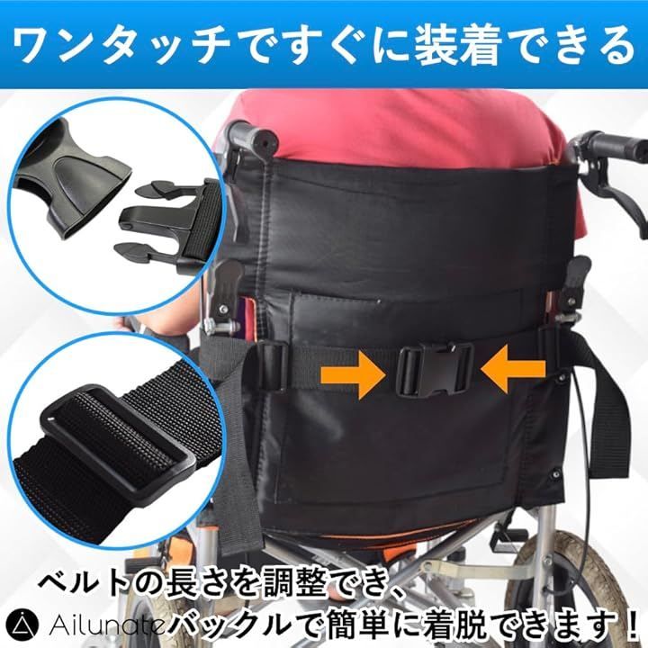 「すぐに装着できる」車椅子の後側に通し、バックルで固定でき、ワンタッチで着脱できます。