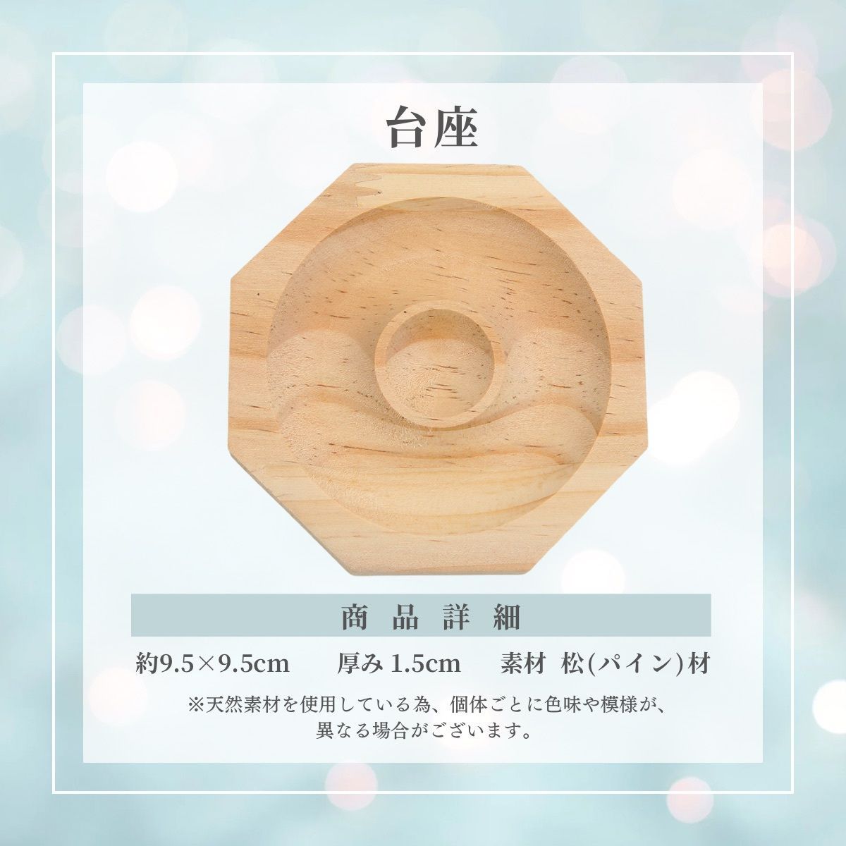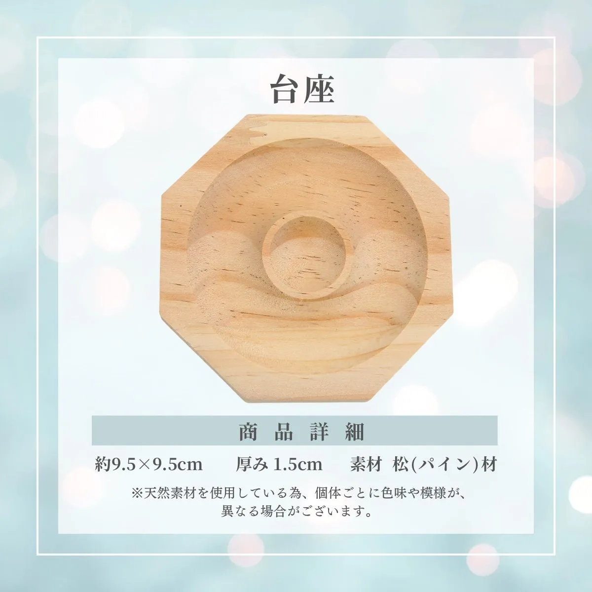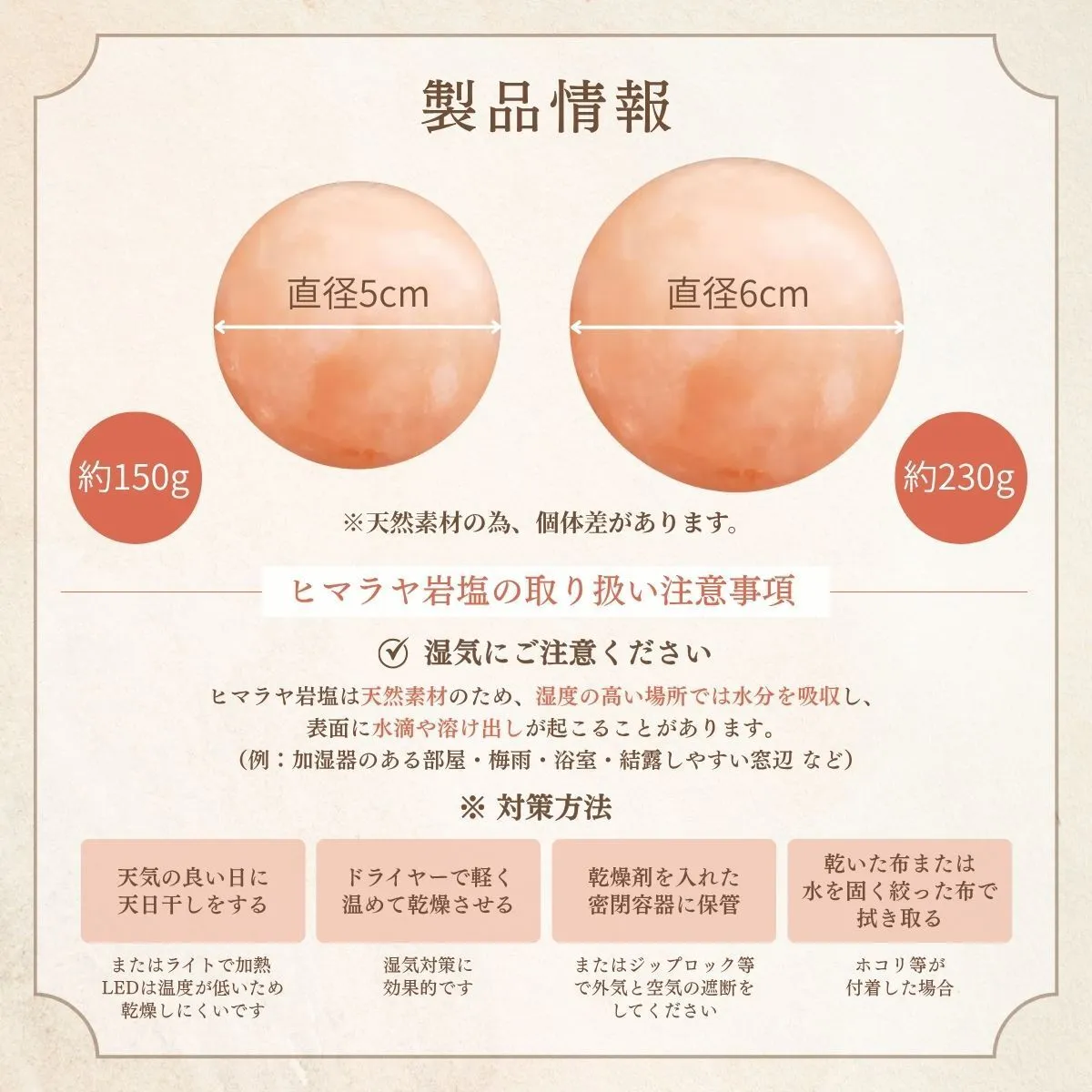 【盛り塩の形とポイント】 ピラミッド型や山型がおすすめ(尖った形は「気」を集めやすいとされる) 小皿や素焼きの器に乗せて使用 サイズ ボール型 約直径5cm 150g 台座サイズ 八角形 約9.5×9.5cm 厚み1.5cm 素材 松(パイン)材 注意事項 ※天然素材を使用している為個体ごとに色味や模様、サイズが異なる場合がございます。 ※照明の具合で実際とは色合いが異なる場合がございます。また、天然素材特有のクラック・内包物を有する場合がございます。予めご了承下さい。 ※ヒマラヤ岩塩は天然素材のため、湿度が高い環境下(加湿器をかけた部屋・梅雨・浴室・結露のある部屋など)では空気中の水分を吸収し、表面に水滴が出たり、塩が溶ける場合があります。 ※水分の多い所での保管は避け、水やお湯は直接かけないでください。