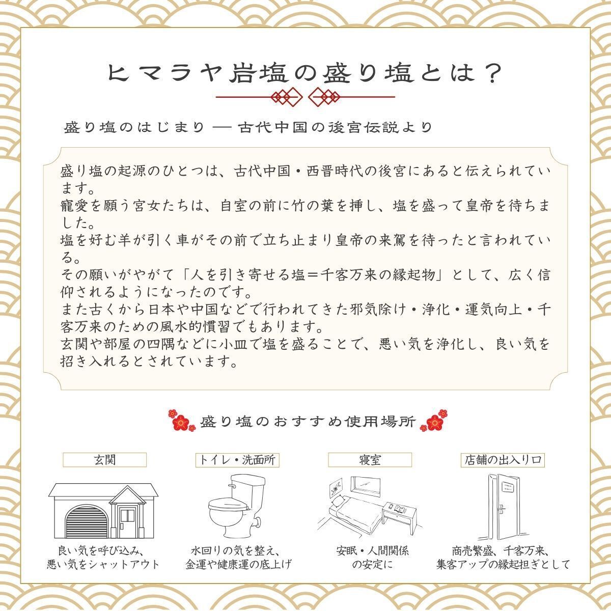 【ヒマラヤ岩塩の盛り塩とは?】 盛り塩のはじまり ― 古代中国の後宮伝説より 盛り塩の起源のひとつは、古代中国・西晋時代の後宮にあると伝えられています。 寵愛を願う宮女たちは、自室の前に竹の葉を挿し、塩を盛って皇帝を待ちました。 塩を好む羊が引く車がその前で立ち止まり皇帝の来駕を待ったと言われている。 その願いがやがて「人を引き寄せる塩=千客万来の縁起物」として、広く信仰されるようになったのです。 また古くから日本や中国などで行われてきた邪気除け・浄化・運気向上・千客万来のための風水的慣習でもあります。 玄関や部屋の四隅などに小皿で塩を盛ることで、悪い気を浄化し、良い気を招き入れるとされています。