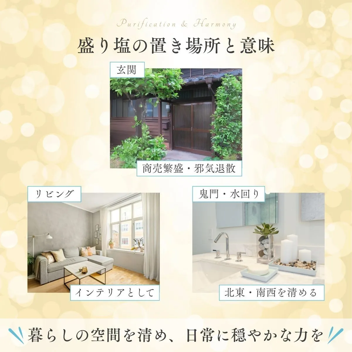 【盛り塩のおすすめ使用場所】 玄関:良い気を呼び込み、悪い気をシャットアウト。 トイレ・洗面所:水回りの気を整え、金運や健康運の底上げ。 寝室:安眠・人間関係の安定に。 店舗の出入り口:商売繁盛、千客万来、集客アップの縁起担ぎとして。