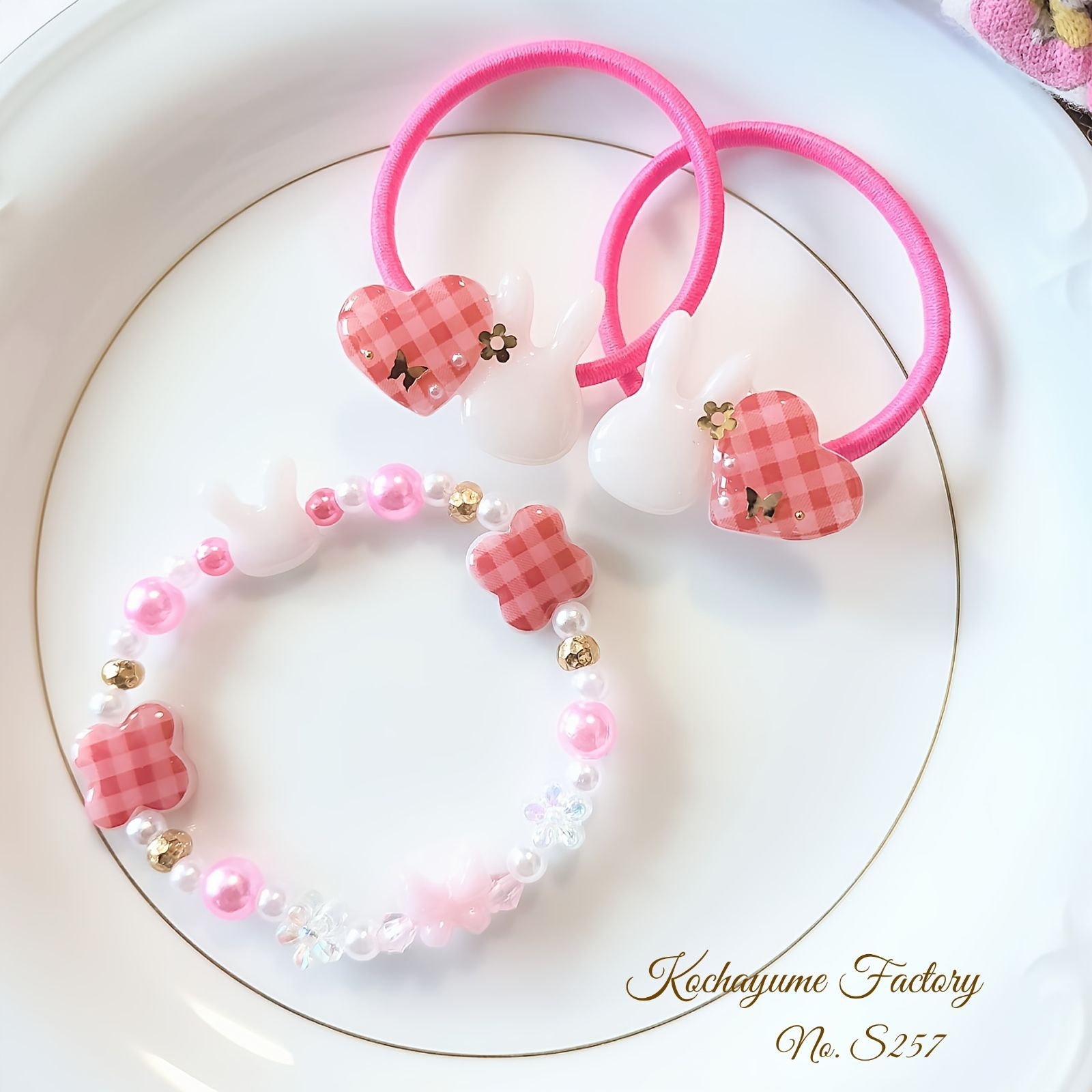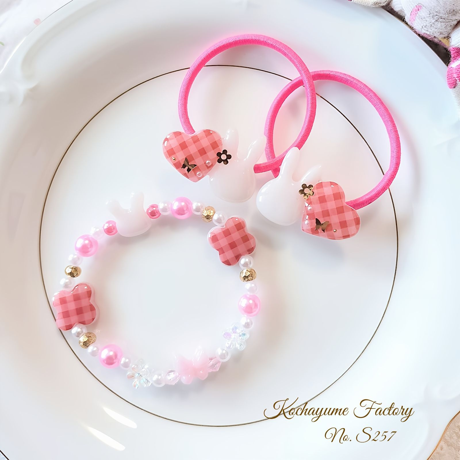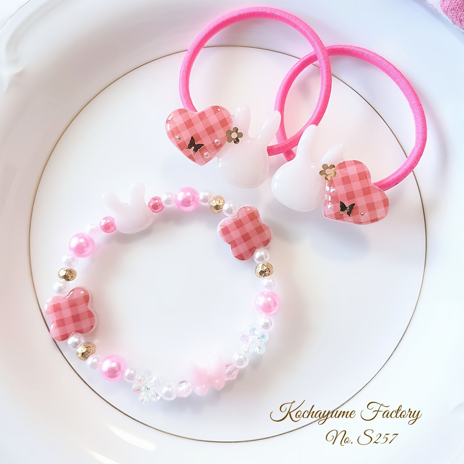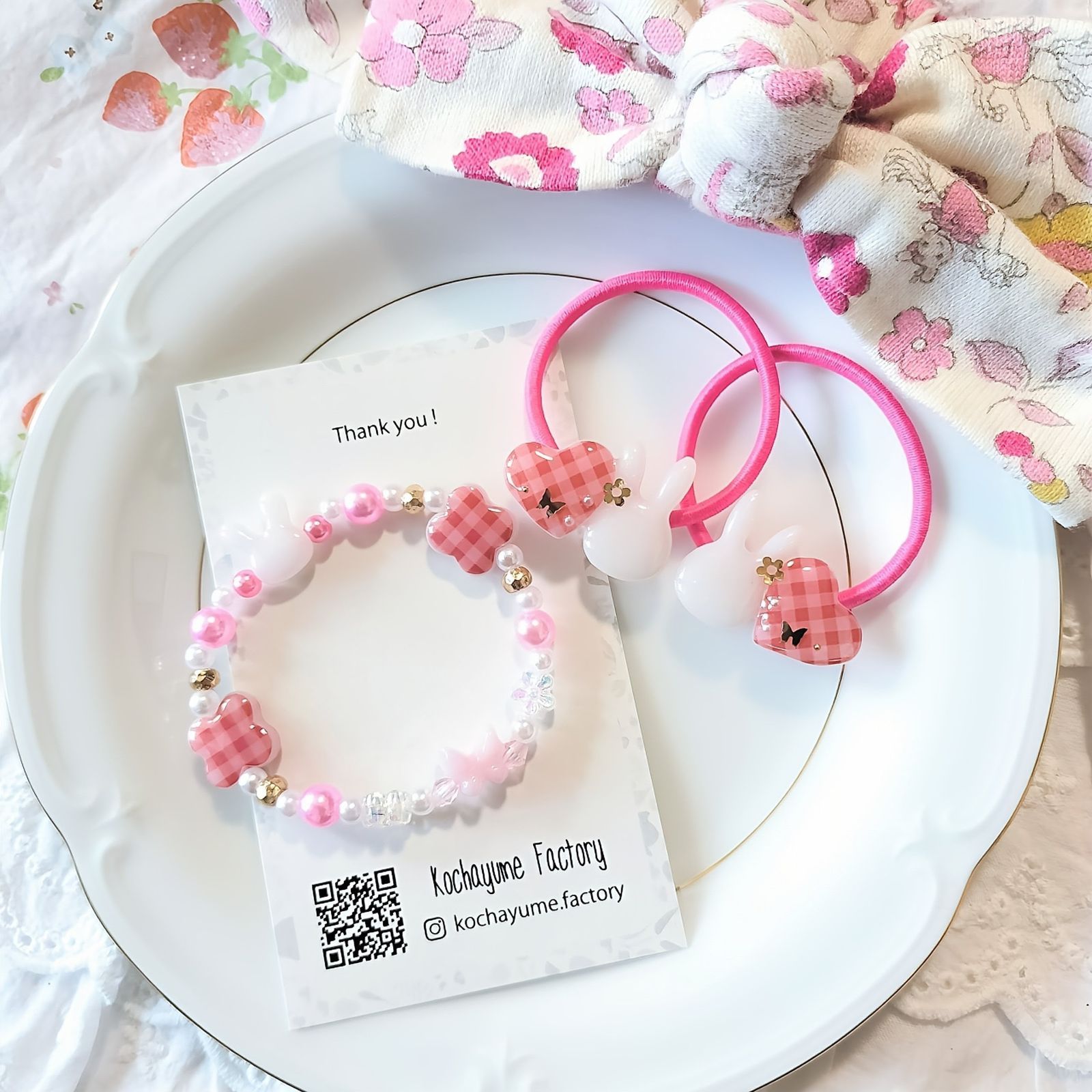 【S257】うさぎちゃんのチェック柄ヘアゴム&ブレスレット キッズアクセサリー キッズブレスレット ビーズブレスレット お花ブレスレット キッズヘアゴム うさぎヘアゴム お誕生日 プレゼント