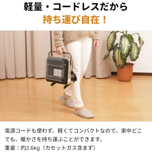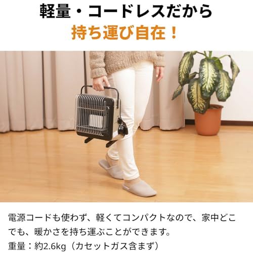 カセットガスストーブ ポータブル『マイ暖』 CB-CGS-PTB カセットガス式ストーブです。電気も電池も使わない!家中どこでも、暖かさを持ち運べるカセットガスストーブです。どこでも手に入るイワタニのカセットガスが燃料なので、非常時用としても備えておくと安心な一台です。 カセットガス式なので燃料の入手や交換が手軽で、面倒な燃料補給の手間もかかりません。交換時に手も汚さず操作もカンタン。 石油を使わないから、都市部のマンションや少人数世帯に最適。 小さく軽量なので、置き場所にスペースを取ることもなく、女性でもどこでも簡単に暖がとれます。 製品の重さは約2.6kg。ラクに持ち運びが可能です。 標準運転・弱運転の2段階を搭載。 ボンベ一本で、標準運転では約3時間20分(約200分)、弱運転では約3時間50分(約230分)使用できます。