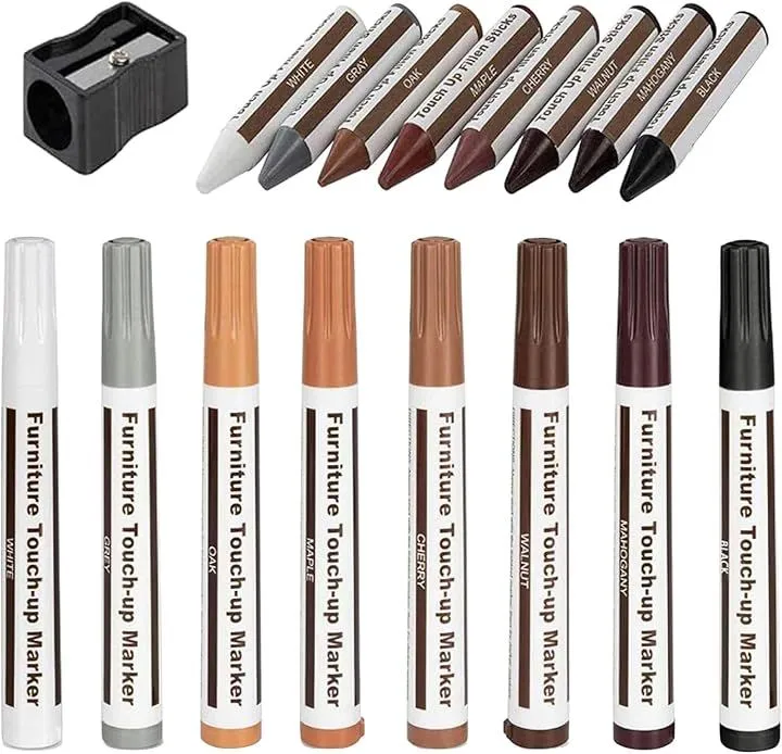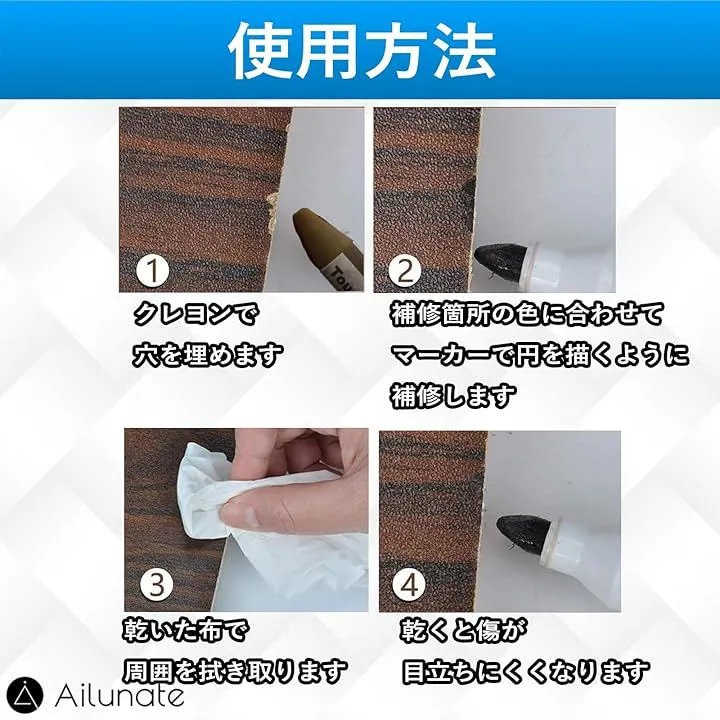 汚れを取り除いた後、クレヨンで凹みを埋め、マーカーで色を合わせるだけで難しい作業は一切ありません。