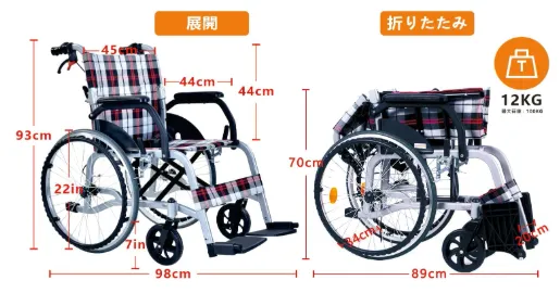 【車椅子のサイズ】重量:12kg。本体:奥行98×幅64.5×高さ93cm。折り畳みサイズ:長89*幅34*高70cm。 座面:幅45cm×奥行44cm×背面高さ44cm。タイヤ:前輪7インチ、後輪22インチ。足置き台はアップグレード!2023年最新、組み立て不要になります。
