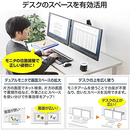 水平空間に対して自由に可動する3関節で、左右に 2画面 設置できる液晶 デュアルモニターアーム です。 VESA 規格(7575mm、100100mm)に準拠した液晶 ディスプレイ 、 モバイルモニター 、 ゲーミングモニター を 2台 取り付けが可能で デュアルディスプレイ の設置ができます。