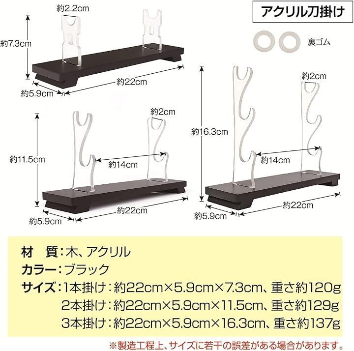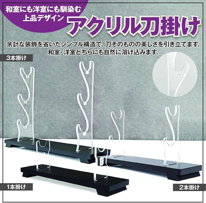 ZERONOWA 刀掛け 黒木製台座 ミニ アクリル 刀置き 日本刀 木刀 小刀 模造刀 クリア (ブラック3本掛け)