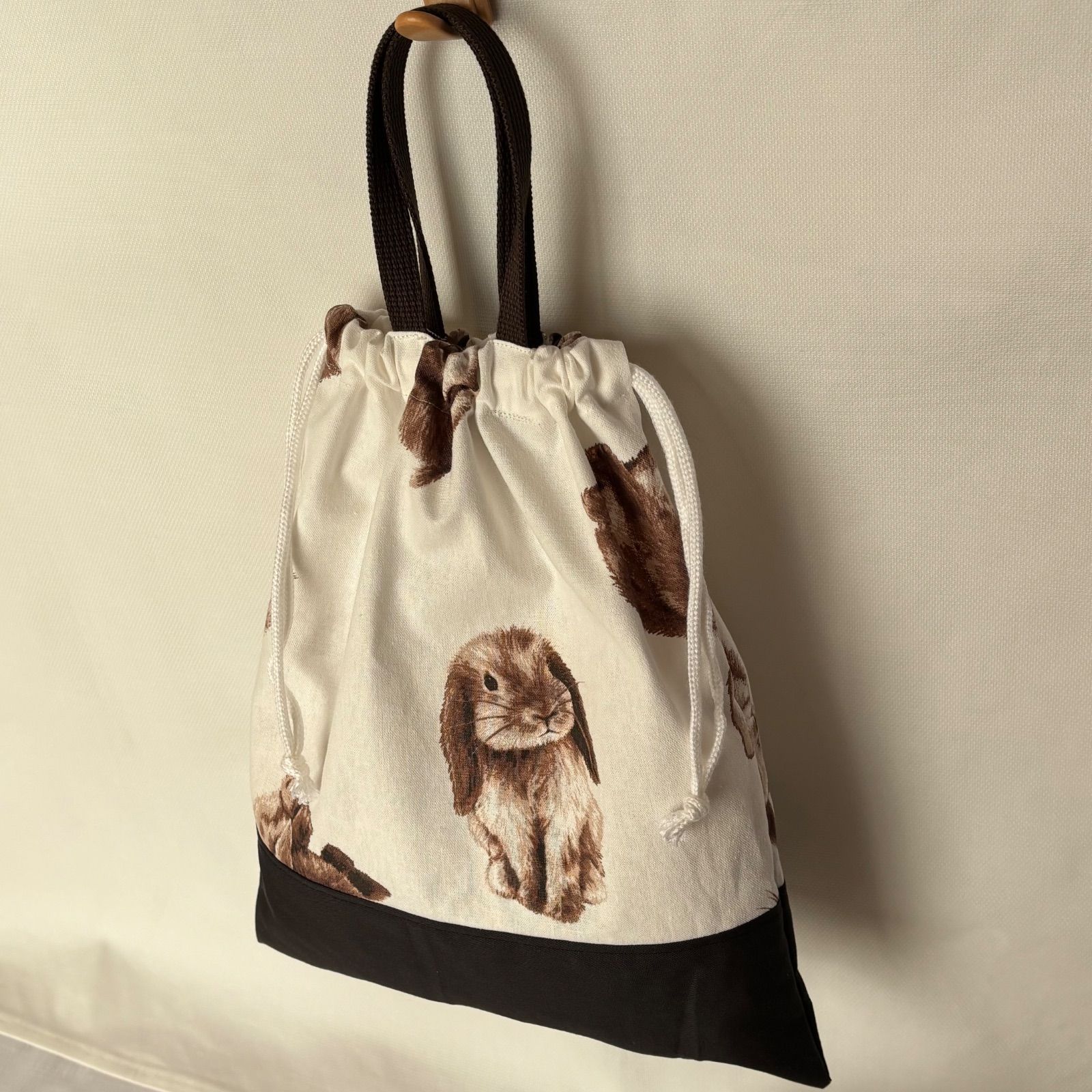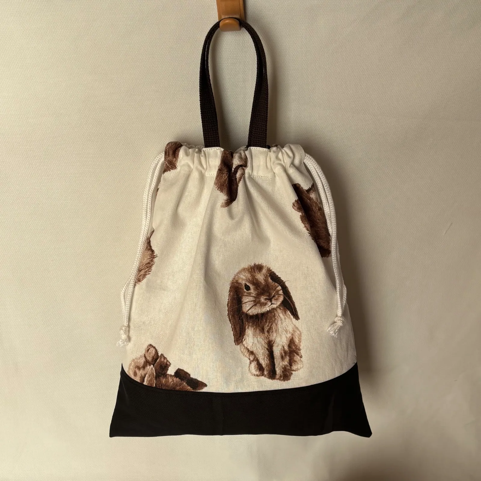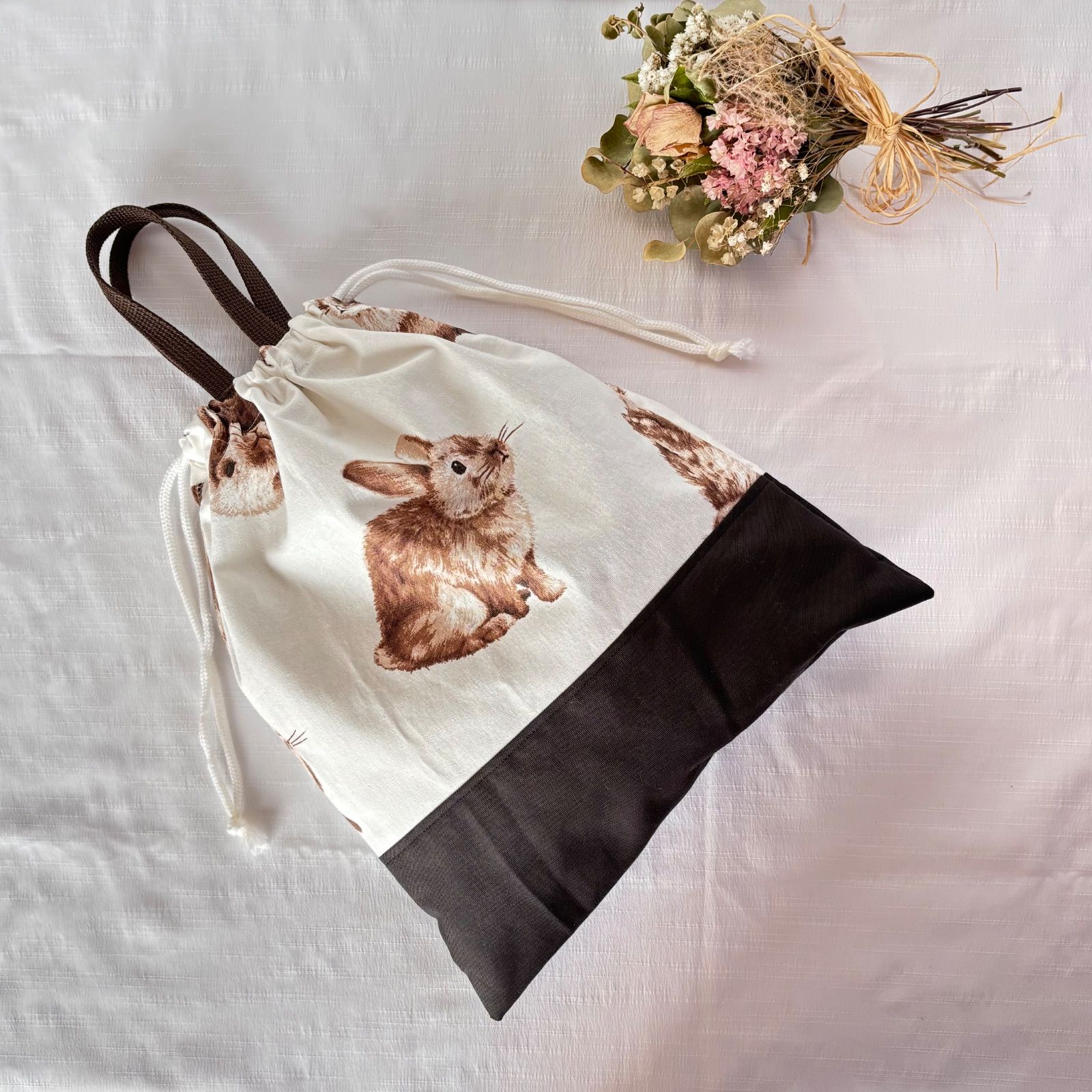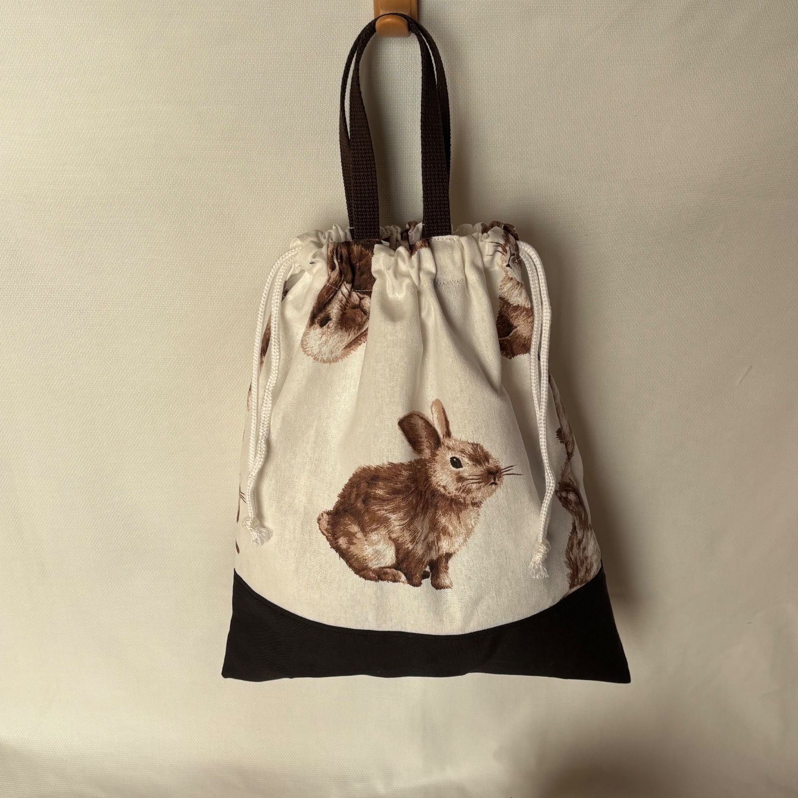 【ハンドメイド】持ち手強化⭐︎体操着袋30×35㎝✿うさぎ(白×チャコールグレー)持ち手付き 巾着 裏地なし お名前タグ付き お着替え袋 女の子 男の子