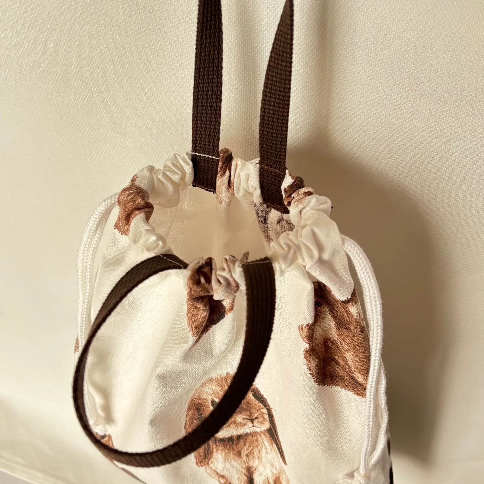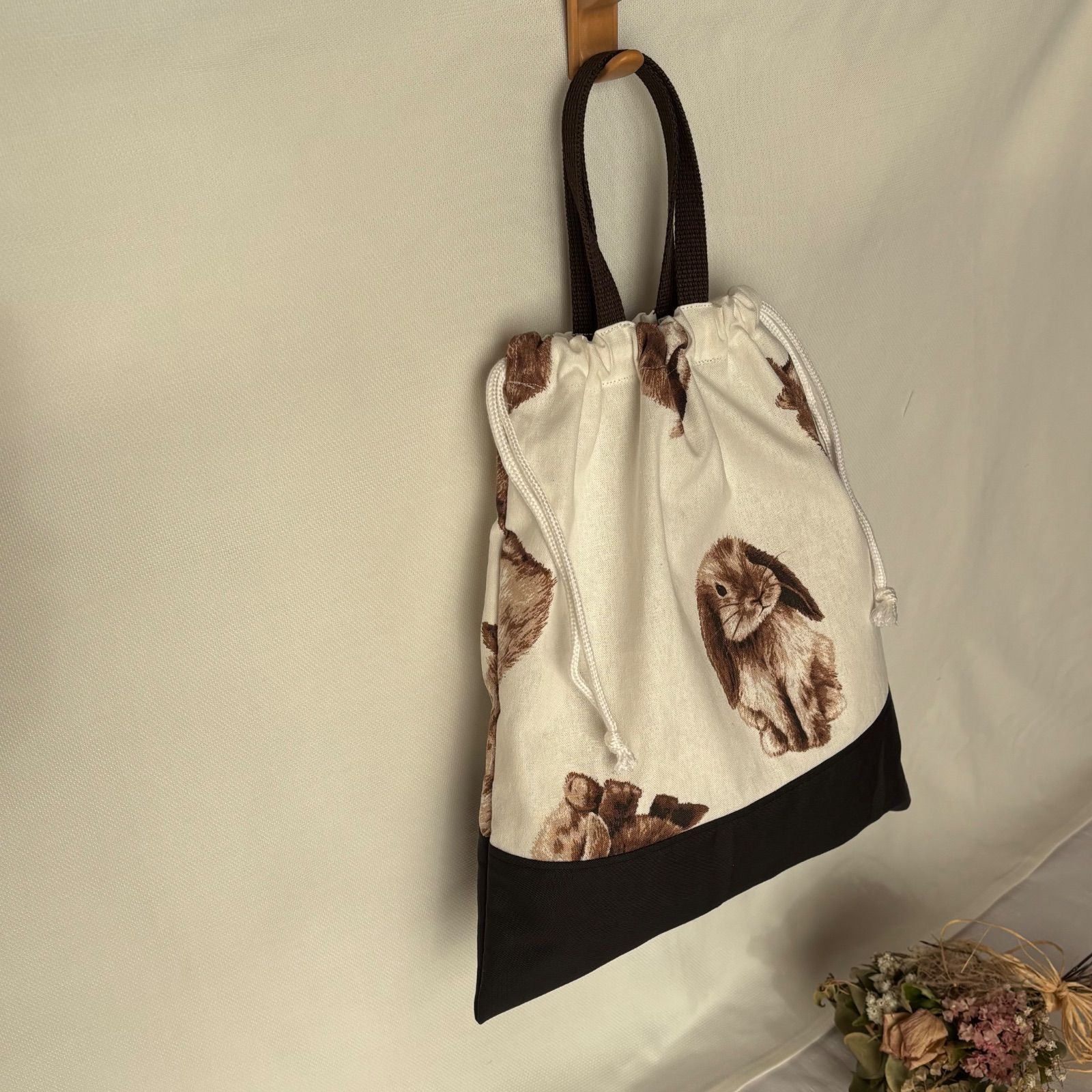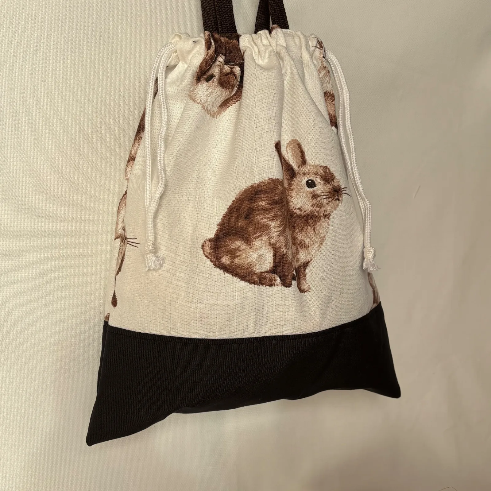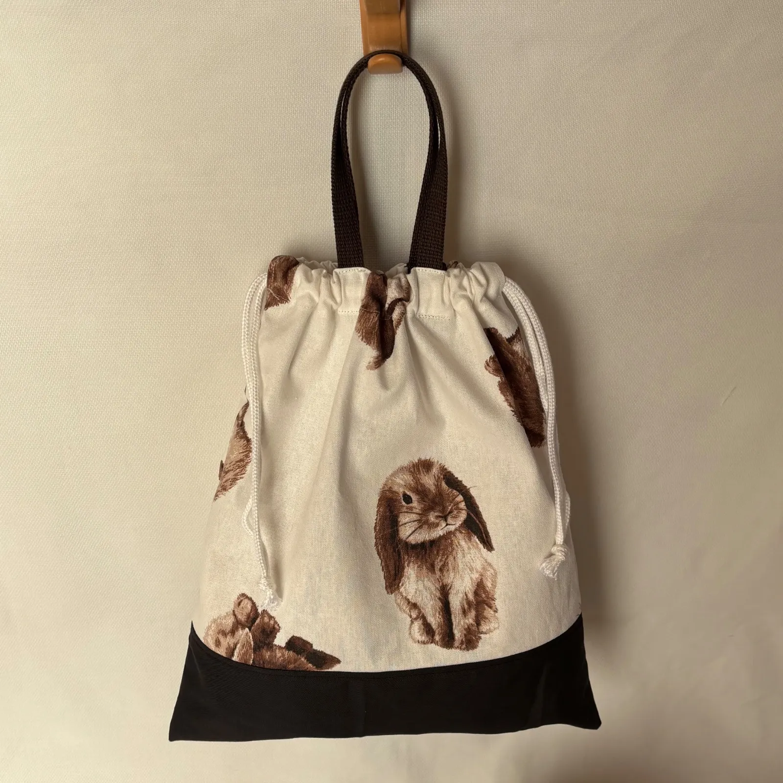 【ハンドメイド】持ち手強化⭐︎体操着袋30×35㎝✿うさぎ(白×チャコールグレー)持ち手付き 巾着 裏地なし お名前タグ付き お着替え袋 女の子 男の子