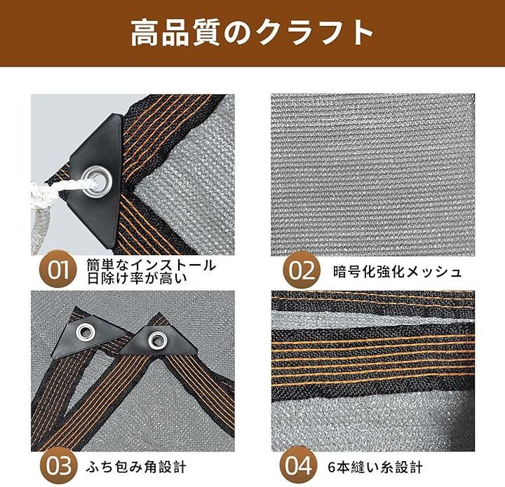 「紫外線防止」生地(HDPE)の染料にUVカット剤を加え、紫外線をしっかりカットできます,遮光率90%~95%で太陽光を大幅にカットします。