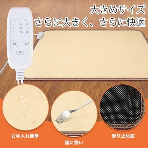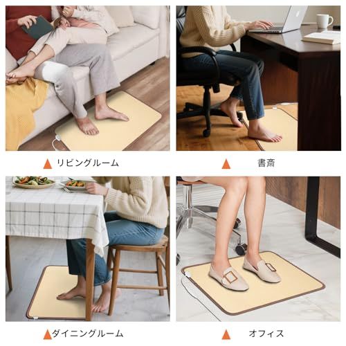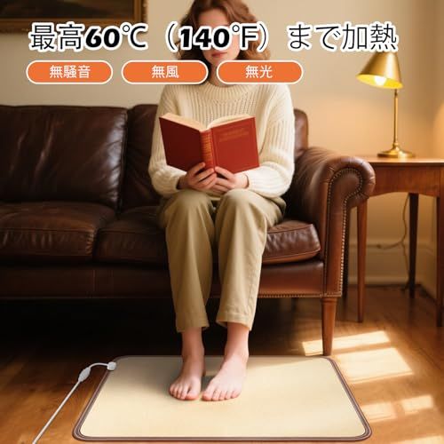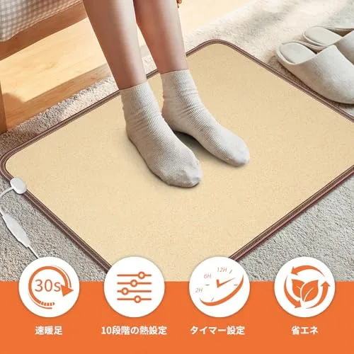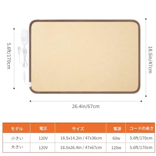 【新品未使用】 足元をすぐに暖める NujorWarm 足元ヒーターはAC100?120V対応で、電源を入れるとすぐに暖かくなります。大サイズ(4767cm)はオフィスやソファ周り、書斎などに最適。小サイズ(4736cm)は一人用や限られたスペースにぴったりです。デスク下に置いて、裸足でも靴を履いたままでも快適にご使用いただけます。仕事中、読書中、リラックスタイムにも静かで心地よい暖かさを提供します。 安全&省エネ設計 大サイズは120W、小サイズは60Wで、従来のヒーターよりも省エネかつ効率的。足元から直接温めるため。過熱防止機能を搭載し、安全性も高く、2 時間で自動的にオフになる安心設計。静音仕様なので、集中したい時や夜間の使用にも最適です簡単操作なので、足元を快適に暖められます。 10段階の温度調節と3つのタイマー このデスク下用フットウォーマーは10段階の温度調節が可能です。56段階の温度調節をお勧めします。このヒーターマットは非常に高温になりますので、ご使用前に靴下を履くことをお勧めします。3つのタイマー設定(2時間、6時間、10時間)と2時間自動電源オフ機能により、より安全で便利な使用感を実現。リビングルーム、オフィス、書斎など、様々な場所に最適です。 家族の冬の必需品 軽量で持ち運びや収納も簡単。折りたたむことはできませんが、丸めて収納可能です。家族全員で使いやすく、両親や友人へのプレゼントにも最適。冬の必需品として、快適で暖かい足元を実現します。