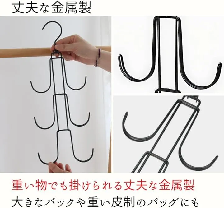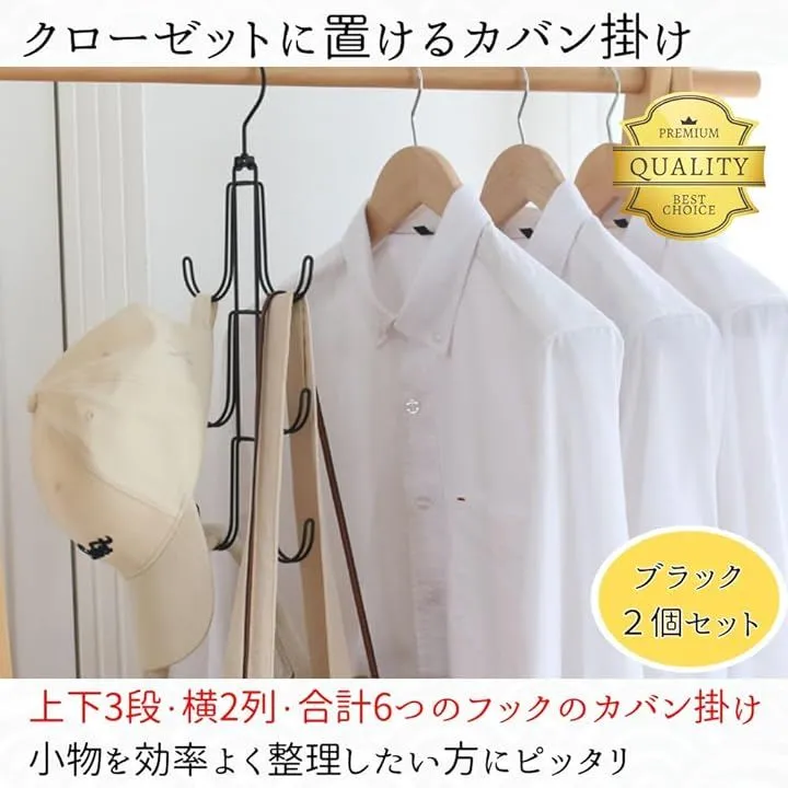 「クローゼットに置ける便利なカバン掛け」クローゼットにも入れられる上下3段・横2列・合計6つのフックのカバン掛け。