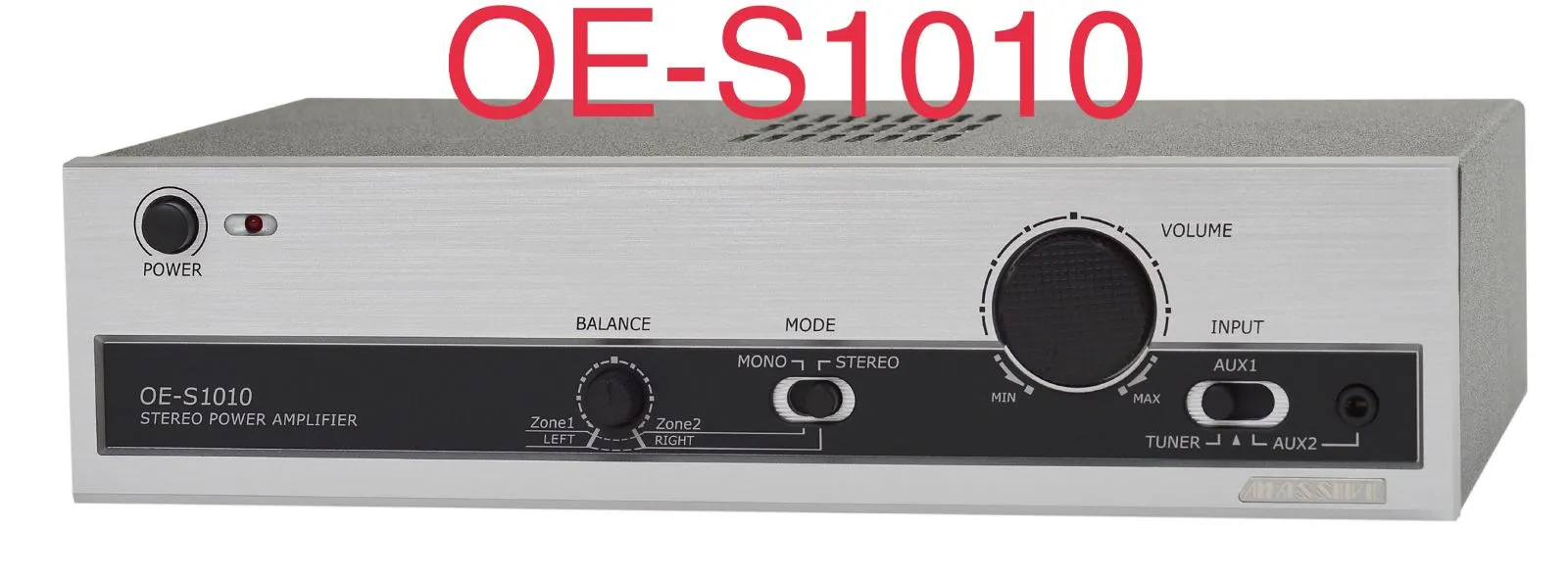 OE-S1010は、ステレオパワーアンプで、AUX入力端子を備え、ボリューム調整機能があります。