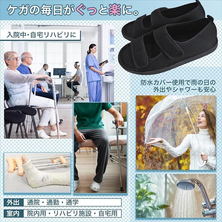SALUDABLE ギプス シューズ リカバリー 介護 サンダル 入院 靴 骨折 防水カバー セット (ブラック, L (26.5–27.0cm))