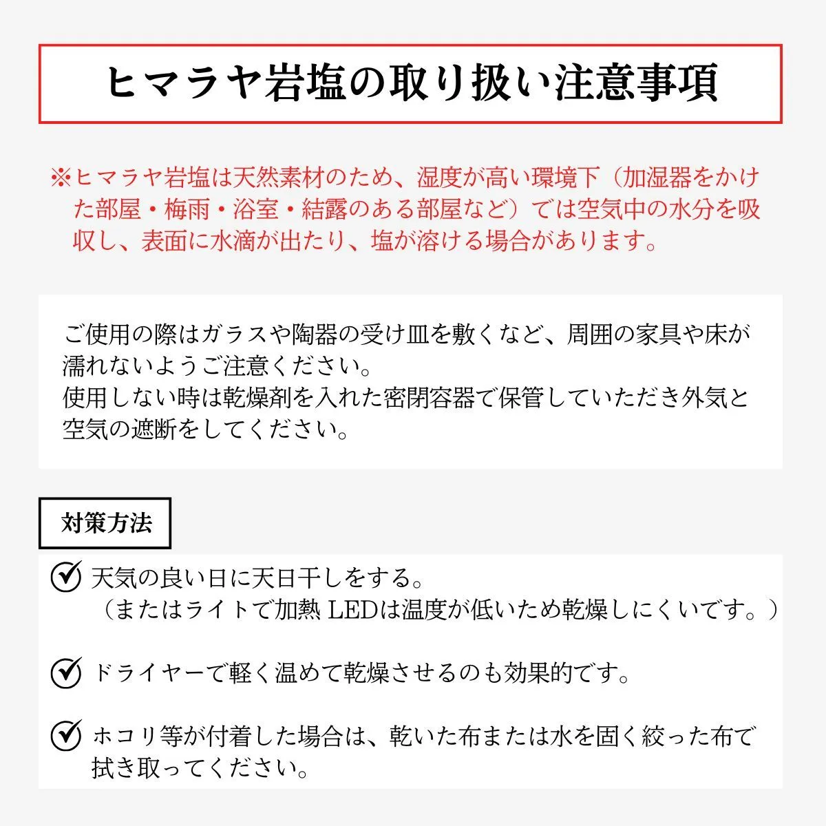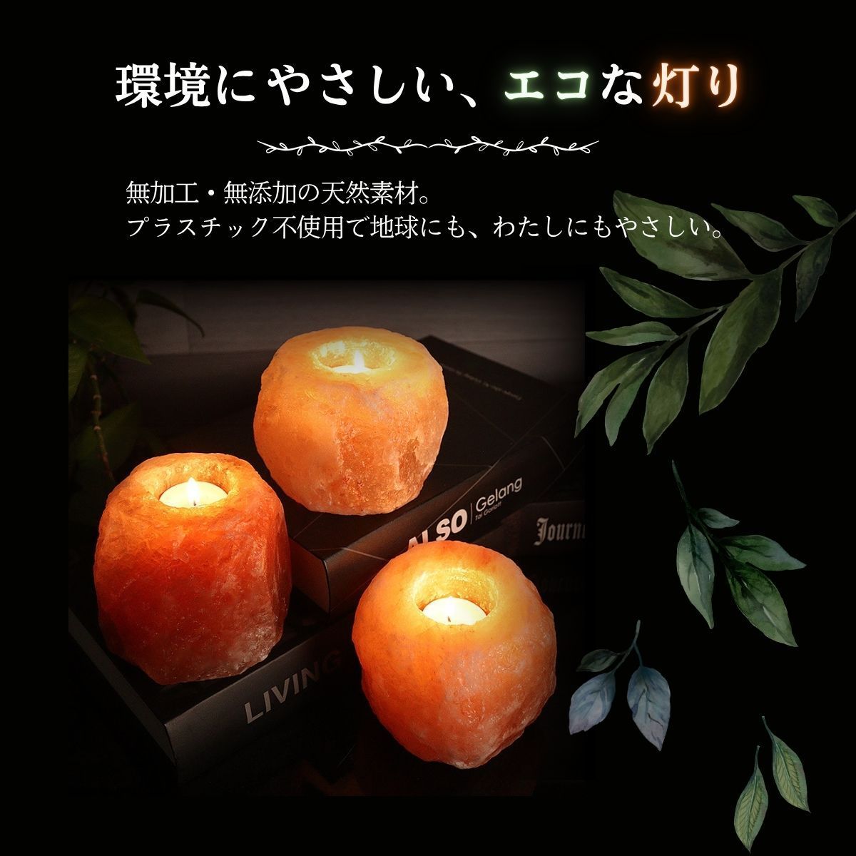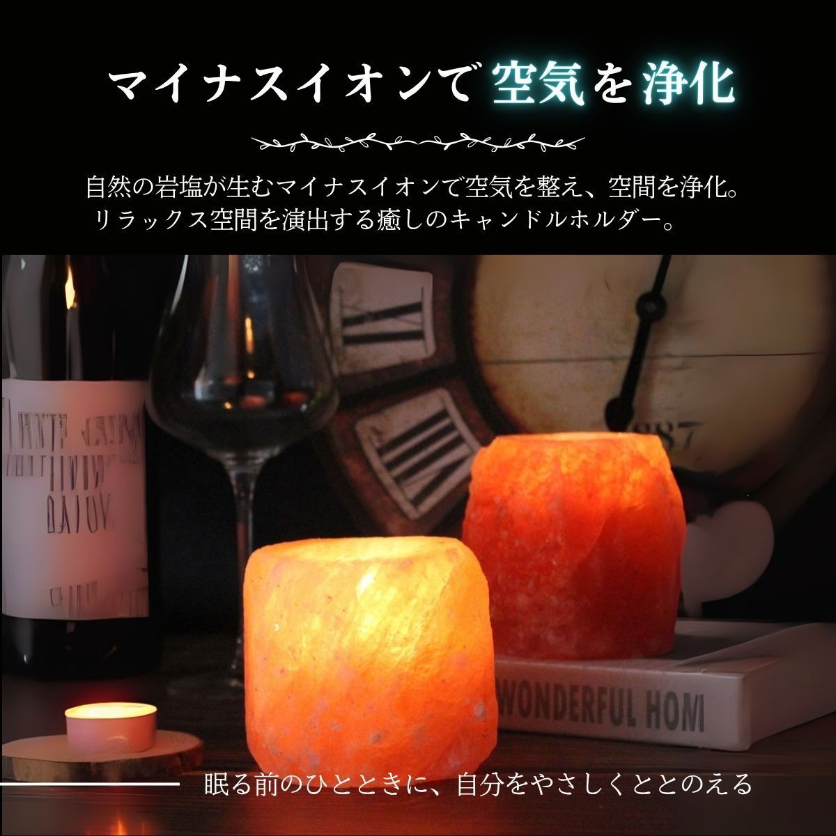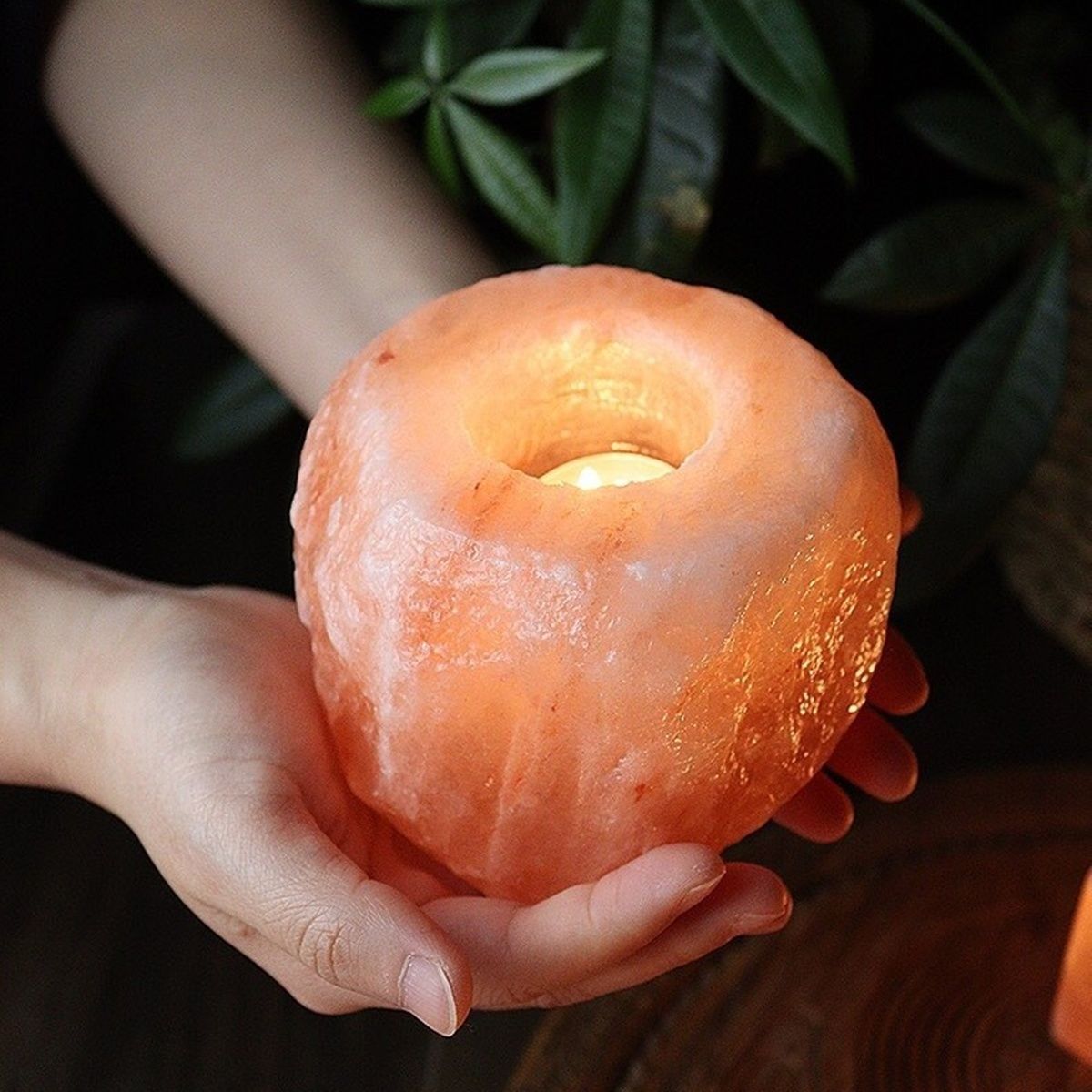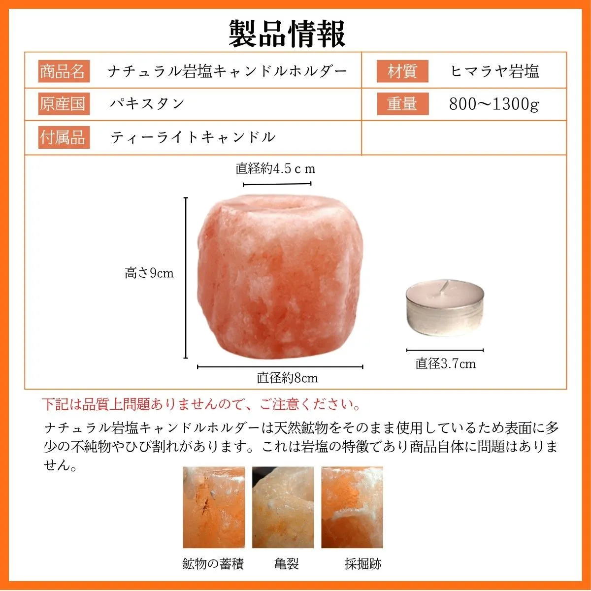【サステナブルで地球にやさしい】 採掘後はほぼ無加工で製品化可能なため、添加物やプラスチックを使わず、ゼロウェイストな暮らしにもマッチ。自然派ライフスタイルにぴったりのエコ素材です。 ヒマラヤ岩塩と風水|開運アイテムとしての魅力 風水においても「邪気を払い、運気を整える石」として知られています。 自然のエネルギーを宿すとされ、以下のような効果が期待されています。 五行の「土」属性:住まいの安定・基盤づくりに ピンク岩塩の象徴:愛情・健康・人間関係運アップ おすすめ配置場所:玄関/寝室/洗面所/トイレ 「陽の気」を引き寄せる空間浄化アイテム 材質 ヒマラヤ岩塩 原産国 パキスタン サイズ 直径約8cm 高さ9cm 穴大きさ 直経約φ4.5cm 当店で販売しているクリアカップ使用可能 重量 800~1300g 付属品 ティーライトキャンドル ヒマラヤ岩塩の取り扱い注意事項 ヒマラヤ岩塩は天然素材のため、湿度が高い環境下(加湿器をかけた部屋・梅雨・浴室・結露のある部屋など)では空気中の水分を吸収し、表面に水滴が出たり、塩が溶ける場合があります。 ご使用の際はガラスや陶器の受け皿を敷くなど、周囲の家具や床が濡れないようご注意ください。 使用しない時は乾燥剤を入れた密閉容器で保管いただくと、状態をより長く保てます。 対策方法 以下のような対策をおすすめします ガラスや陶器製の受け皿を敷く 天気の良い日に天日干しをする。 (またはライトで加熱 LEDは温度が低いため乾燥しにくいです。) ご使用にならない時は乾燥剤を入れた密閉容器に保管する。またはジップロック等で外気と空気の遮断をしてください。 ドライヤーで軽く温めて乾燥させるのも効果的です。 ホコリ等が付着した場合は、乾いた布または水を固く絞った布で拭き取ってください。 注意事項 ※上記のサイズと重量は平均値です。 ※鉱物の蓄積、亀裂、採掘跡 ナチュラル岩塩キャンドルホルダーは天然鉱物をそのまま使用しているため表面に多少の不純物やひび割れがあります。 これは岩塩の特徴であり商品自体に問題はありません。 ※ナチュラル岩塩キャンドルホルダーは、型や大量生産を一切行わず、手作りで丁寧に仕上げているため、一つ一つ風合いが異なります。 ※この商品は食用、入浴用ではありません。観賞用としてお使いください。