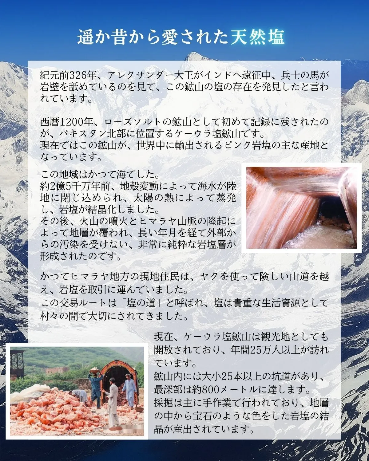 【ヒマラヤ岩塩の魅力と産地紹介】 ヒマラヤ山脈の麓、パキスタンの岩塩鉱山で採掘された天然岩塩です。 本品は、ヒマラヤ山脈の麓、パキスタンの岩塩鉱山で採掘された天然岩塩です。数億年前の太古の海水が地殻変動により閉じ込められ、長い年月をかけて結晶化した、自然が育んだ美しい結晶。"自然のタイムカプセル"とも呼ばれています。