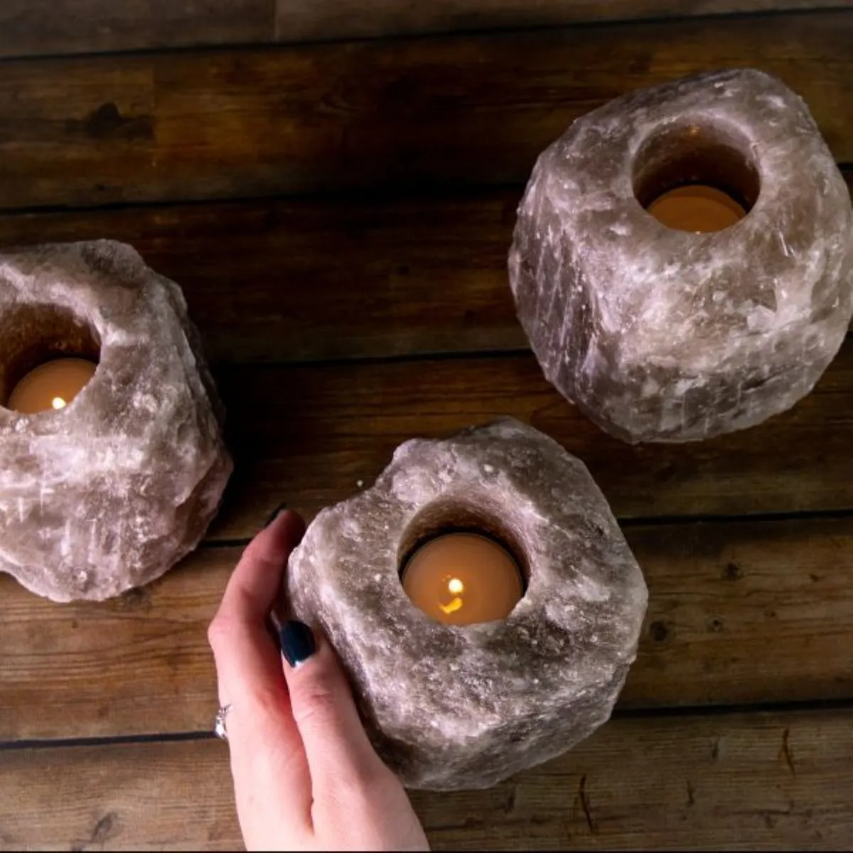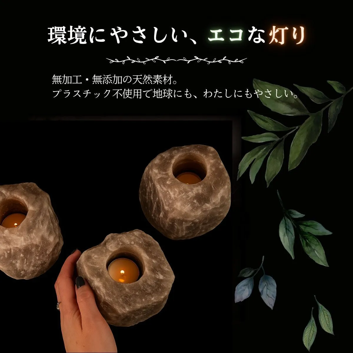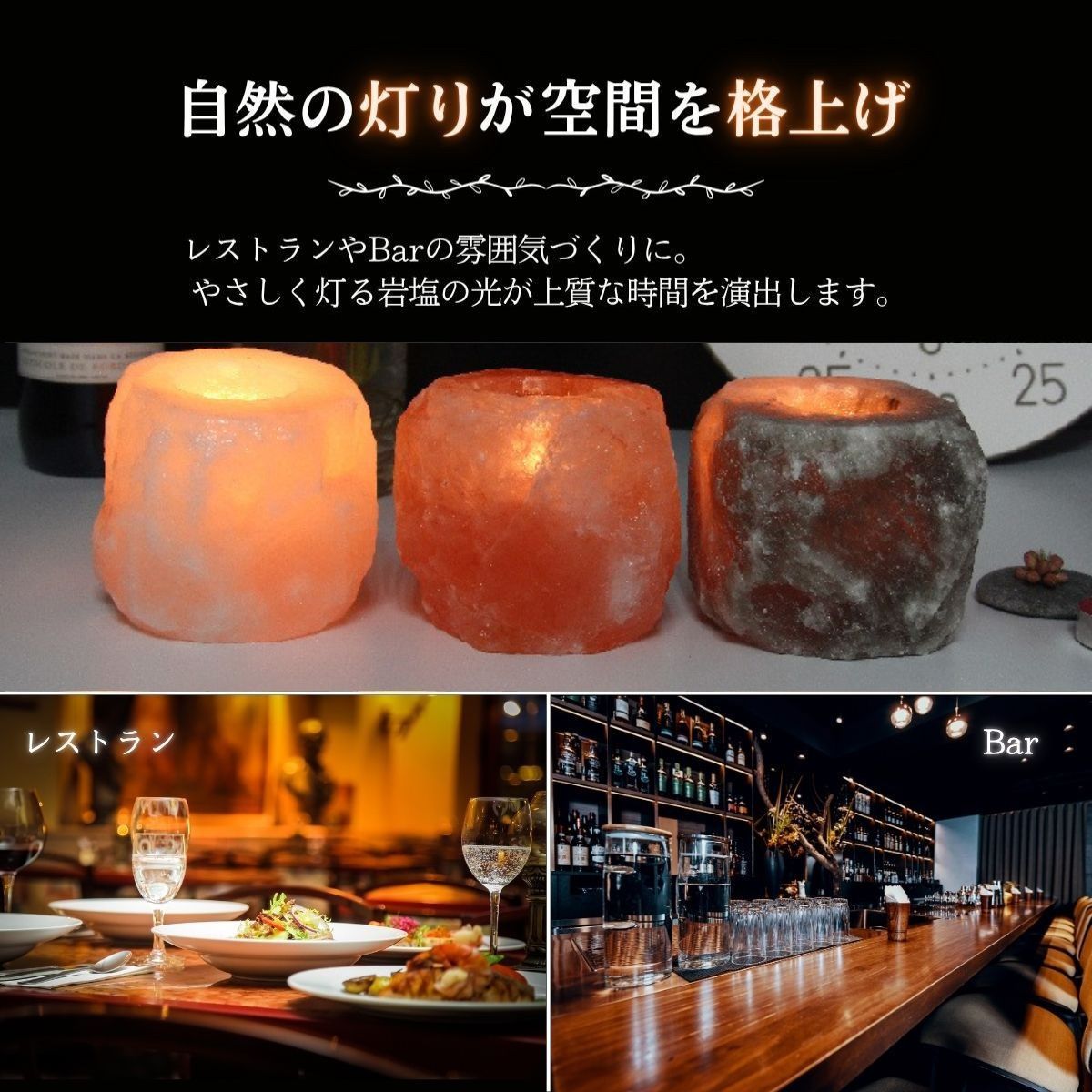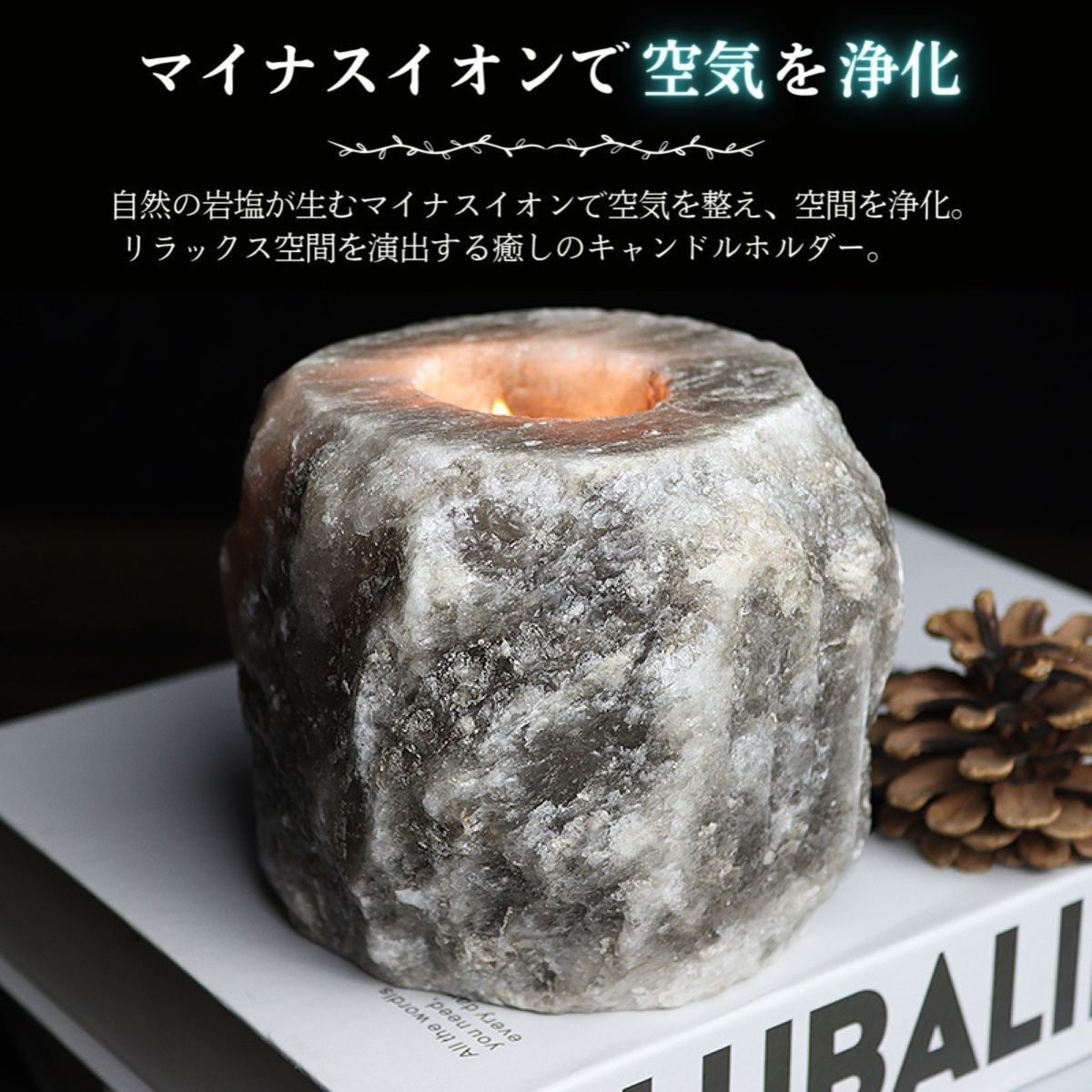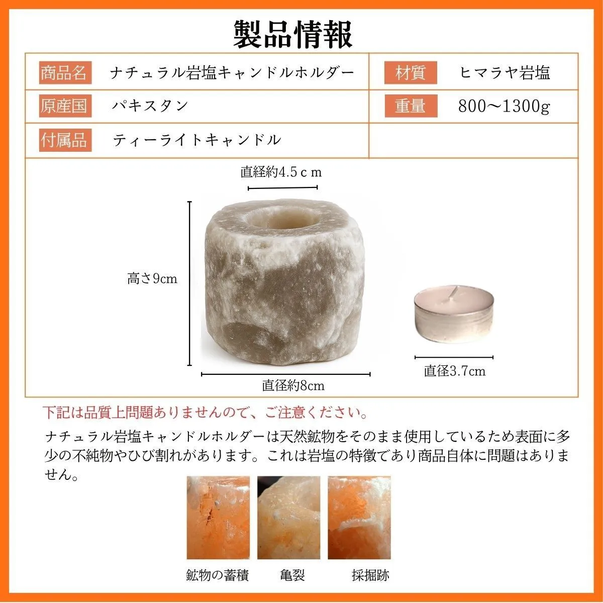 【サステナブルで地球にやさしい】 採掘後はほぼ無加工で製品化可能なため、添加物やプラスチックを使わず、ゼロウェイストな暮らしにもマッチ。自然派ライフスタイルにぴったりのエコ素材です。 ヒマラヤ岩塩と風水|開運アイテムとしての魅力 風水においても「邪気を払い、運気を整える石」として知られています。 自然のエネルギーを宿すとされ、以下のような効果が期待されています。 五行の「土」属性:住まいの安定・基盤づくりに ピンク岩塩の象徴:愛情・健康・人間関係運アップ おすすめ配置場所:玄関/寝室/洗面所/トイレ 「陽の気」を引き寄せる空間浄化アイテム 材質 ヒマラヤ岩塩 原産国 パキスタン サイズ 直径約8cm 高さ9cm 穴大きさ 直経約φ4.5cm 当店で販売しているクリアカップ使用可能 重量 800~1300g 付属品 ティーライトキャンドル ヒマラヤ岩塩の取り扱い注意事項 ヒマラヤ岩塩は天然素材のため、湿度が高い環境下(加湿器をかけた部屋・梅雨・浴室・結露のある部屋など)では空気中の水分を吸収し、表面に水滴が出たり、塩が溶ける場合があります。 ご使用の際はガラスや陶器の受け皿を敷くなど、周囲の家具や床が濡れないようご注意ください。 使用しない時は乾燥剤を入れた密閉容器で保管いただくと、状態をより長く保てます。 対策方法 以下のような対策をおすすめします ガラスや陶器製の受け皿を敷く 天気の良い日に天日干しをする。 (またはライトで加熱 LEDは温度が低いため乾燥しにくいです。) ご使用にならない時は乾燥剤を入れた密閉容器に保管する。またはジップロック等で外気と空気の遮断をしてください。 ドライヤーで軽く温めて乾燥させるのも効果的です。 ホコリ等が付着した場合は、乾いた布または水を固く絞った布で拭き取ってください。 注意事項 ※上記のサイズと重量は平均値です。 ※鉱物の蓄積、亀裂、採掘跡 ナチュラル岩塩キャンドルホルダーは天然鉱物をそのまま使用しているため表面に多少の不純物やひび割れがあります。 これは岩塩の特徴であり商品自体に問題はありません。 ※ナチュラル岩塩キャンドルホルダーは、型や大量生産を一切行わず、手作りで丁寧に仕上げているため、一つ一つ風合いが異なります。 ※この商品は食用、入浴用ではありません。観賞用としてお使いください。