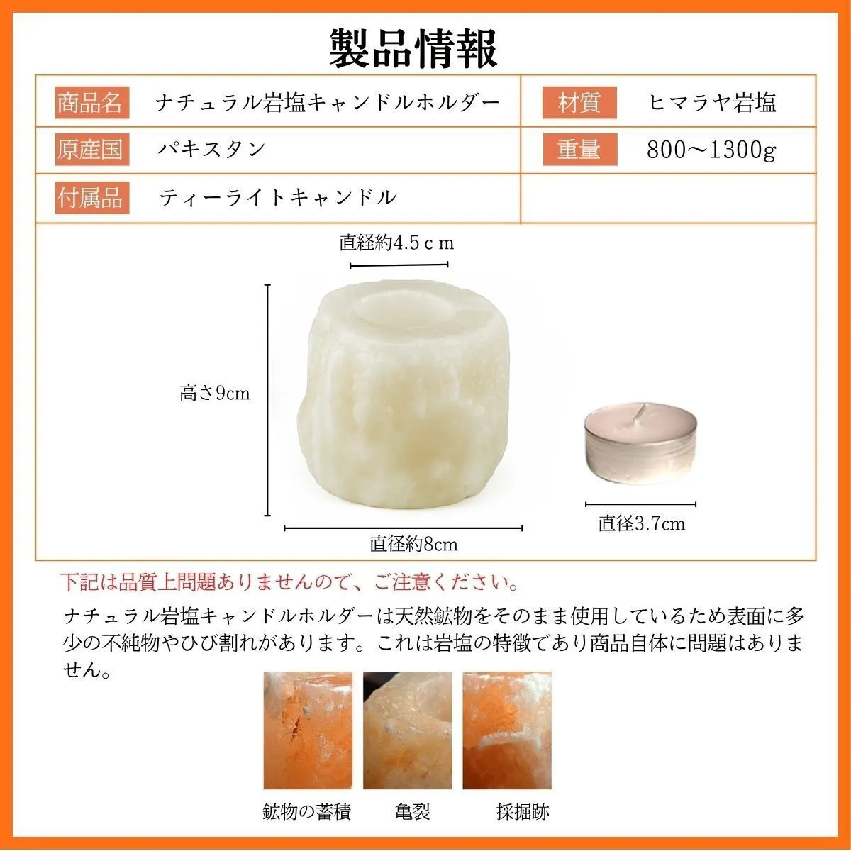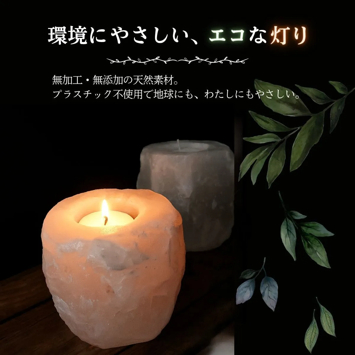 【サステナブルで地球にやさしい】 採掘後はほぼ無加工で製品化可能なため、添加物やプラスチックを使わず、ゼロウェイストな暮らしにもマッチ。自然派ライフスタイルにぴったりのエコ素材です。 ヒマラヤ岩塩と風水|開運アイテムとしての魅力 風水においても「邪気を払い、運気を整える石」として知られています。 自然のエネルギーを宿すとされ、以下のような効果が期待されています。 五行の「土」属性:住まいの安定・基盤づくりに ピンク岩塩の象徴:愛情・健康・人間関係運アップ おすすめ配置場所:玄関/寝室/洗面所/トイレ 「陽の気」を引き寄せる空間浄化アイテム 材質 ヒマラヤ岩塩 原産国 パキスタン サイズ 直径約8cm 高さ9cm 穴大きさ 直経約φ4.5cm 当店で販売しているクリアカップ使用可能 重量 800~1300g 付属品 ティーライトキャンドル ヒマラヤ岩塩の取り扱い注意事項 ヒマラヤ岩塩は天然素材のため、湿度が高い環境下(加湿器をかけた部屋・梅雨・浴室・結露のある部屋など)では空気中の水分を吸収し、表面に水滴が出たり、塩が溶ける場合があります。 ご使用の際はガラスや陶器の受け皿を敷くなど、周囲の家具や床が濡れないようご注意ください。 使用しない時は乾燥剤を入れた密閉容器で保管いただくと、状態をより長く保てます。 対策方法 以下のような対策をおすすめします ガラスや陶器製の受け皿を敷く 天気の良い日に天日干しをする。 (またはライトで加熱 LEDは温度が低いため乾燥しにくいです。) ご使用にならない時は乾燥剤を入れた密閉容器に保管する。またはジップロック等で外気と空気の遮断をしてください。 ドライヤーで軽く温めて乾燥させるのも効果的です。 ホコリ等が付着した場合は、乾いた布または水を固く絞った布で拭き取ってください。 注意事項 ※上記のサイズと重量は平均値です。 ※鉱物の蓄積、亀裂、採掘跡 ナチュラル岩塩キャンドルホルダーは天然鉱物をそのまま使用しているため表面に多少の不純物やひび割れがあります。 これは岩塩の特徴であり商品自体に問題はありません。 ※ナチュラル岩塩キャンドルホルダーは、型や大量生産を一切行わず、手作りで丁寧に仕上げているため、一つ一つ風合いが異なります。 ※この商品は食用、入浴用ではありません。観賞用としてお使いください。