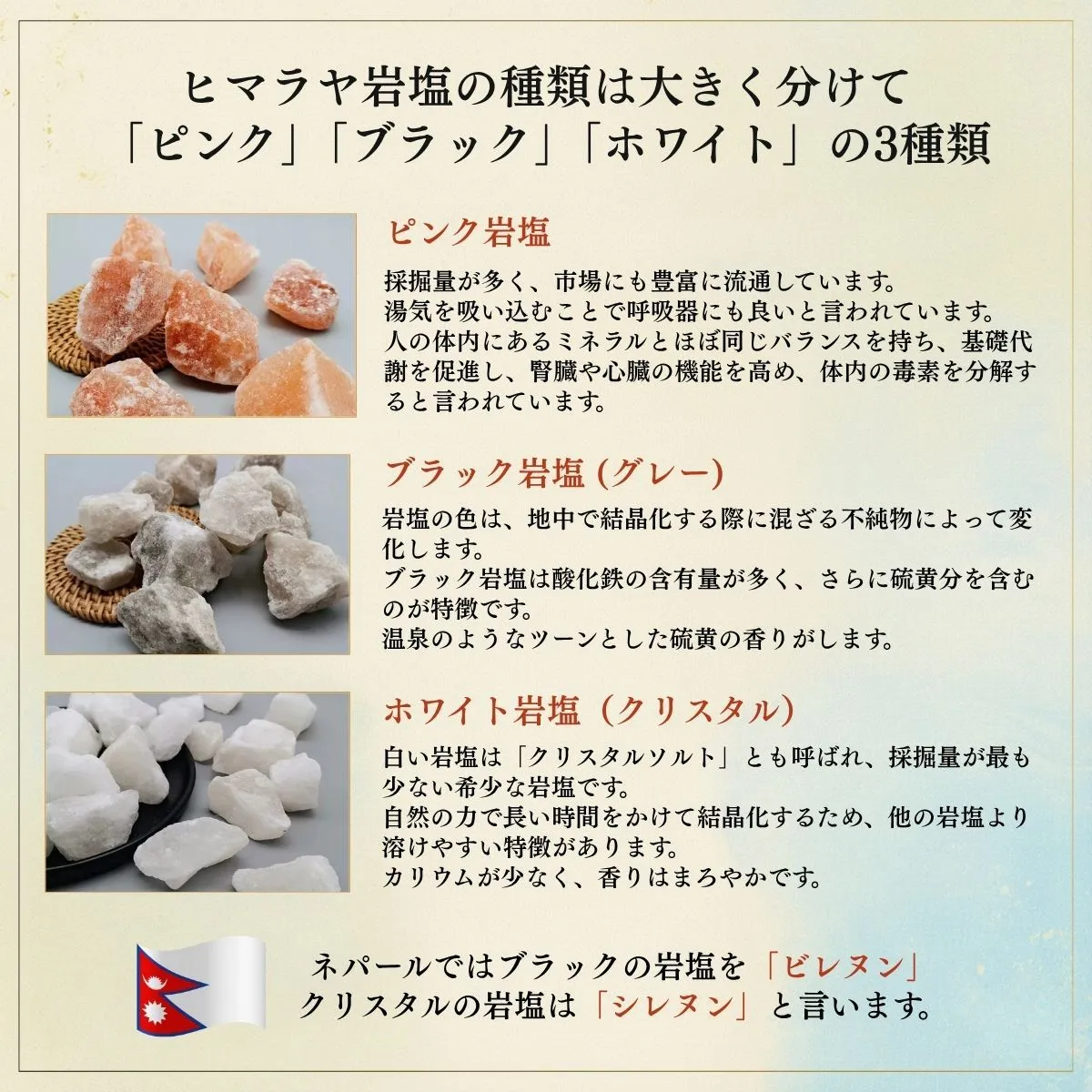 【ヒマラヤ岩塩の魅力と産地紹介】 ヒマラヤ山脈の麓、パキスタンの岩塩鉱山で採掘された天然岩塩です。 本品は、ヒマラヤ山脈の麓、パキスタンの岩塩鉱山で採掘された天然岩塩です。数億年前の太古の海水が地殻変動により閉じ込められ、長い年月をかけて結晶化した、自然が育んだ美しい結晶。"自然のタイムカプセル"とも呼ばれています。