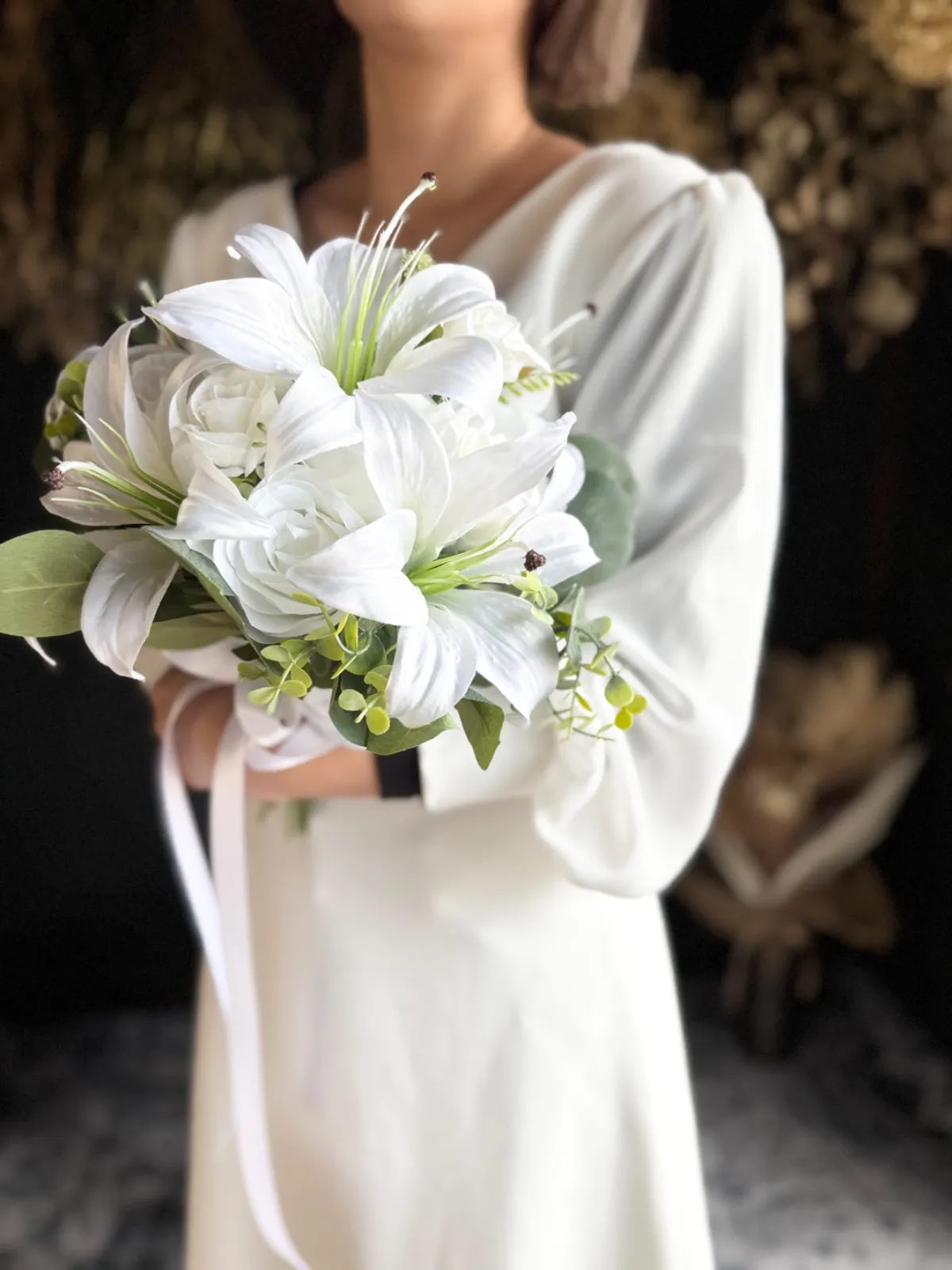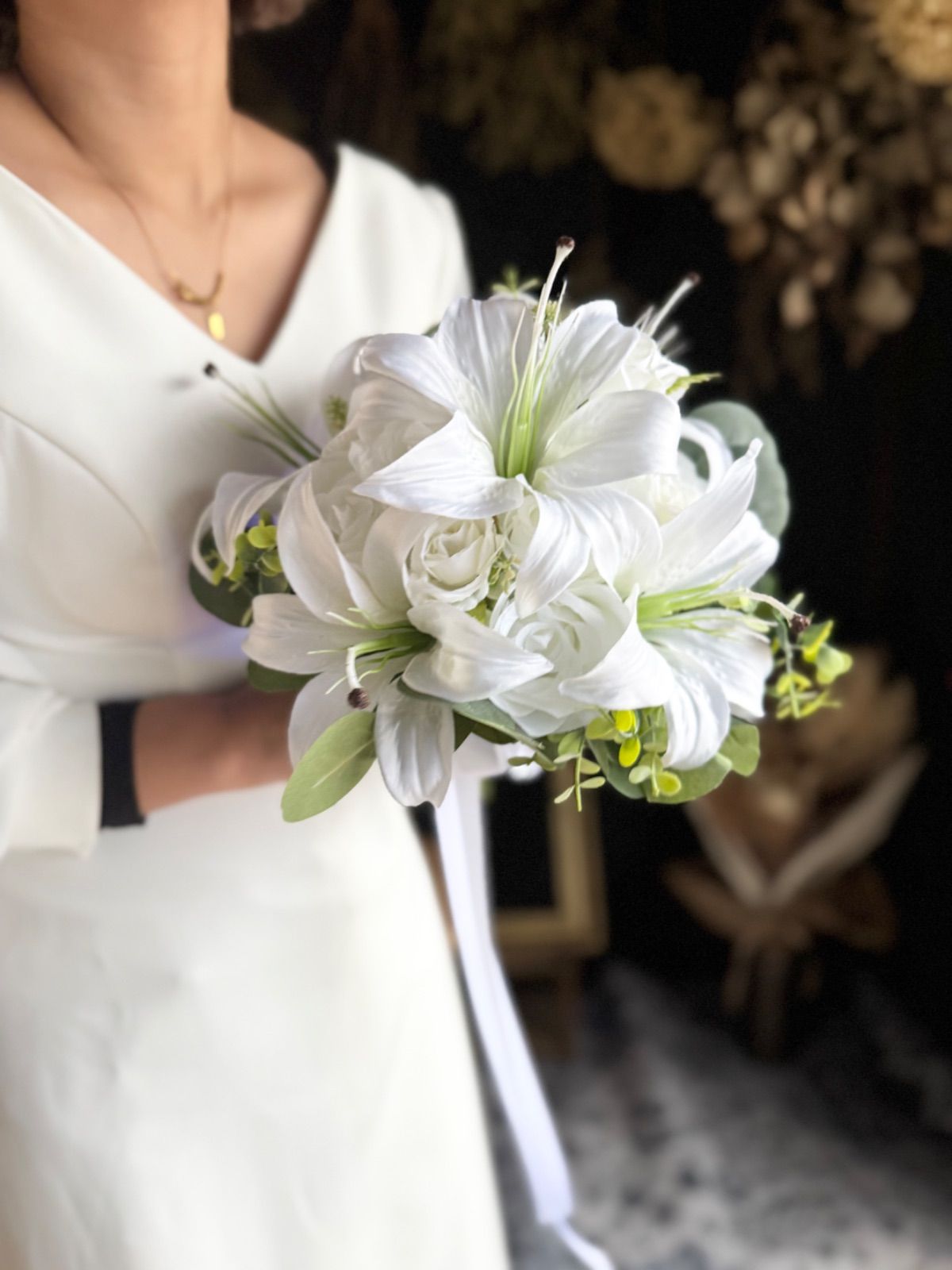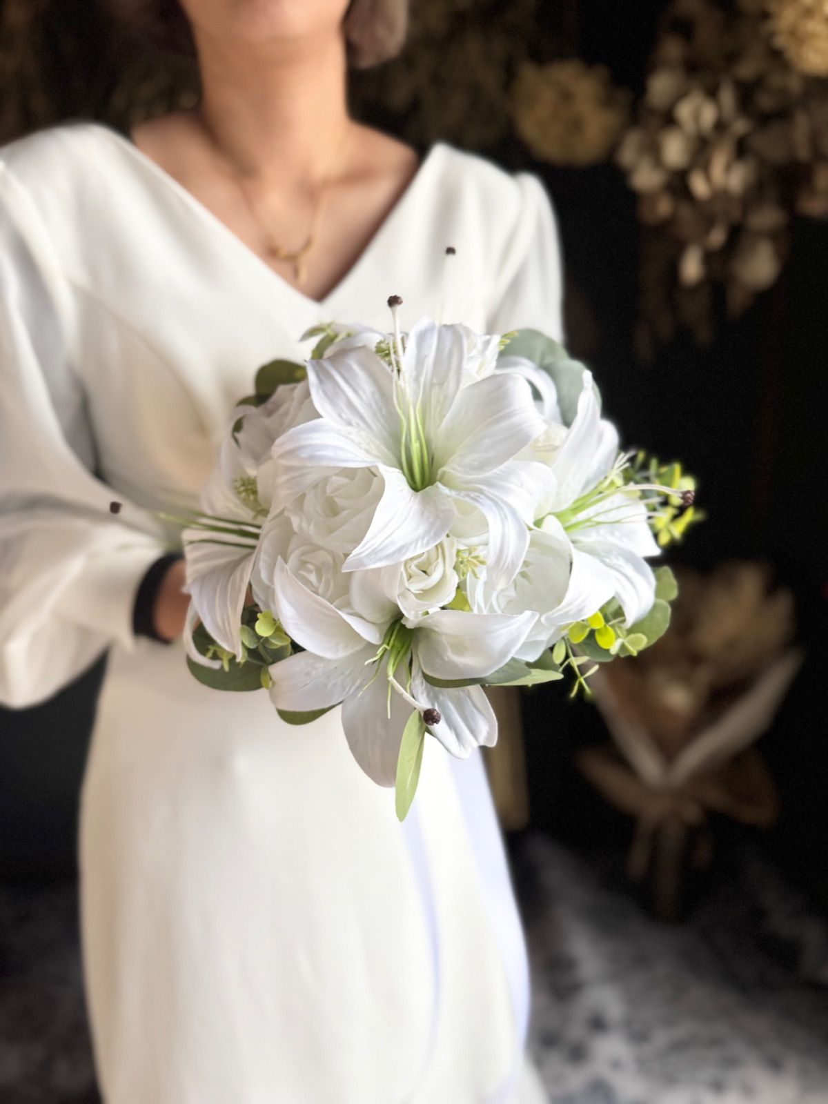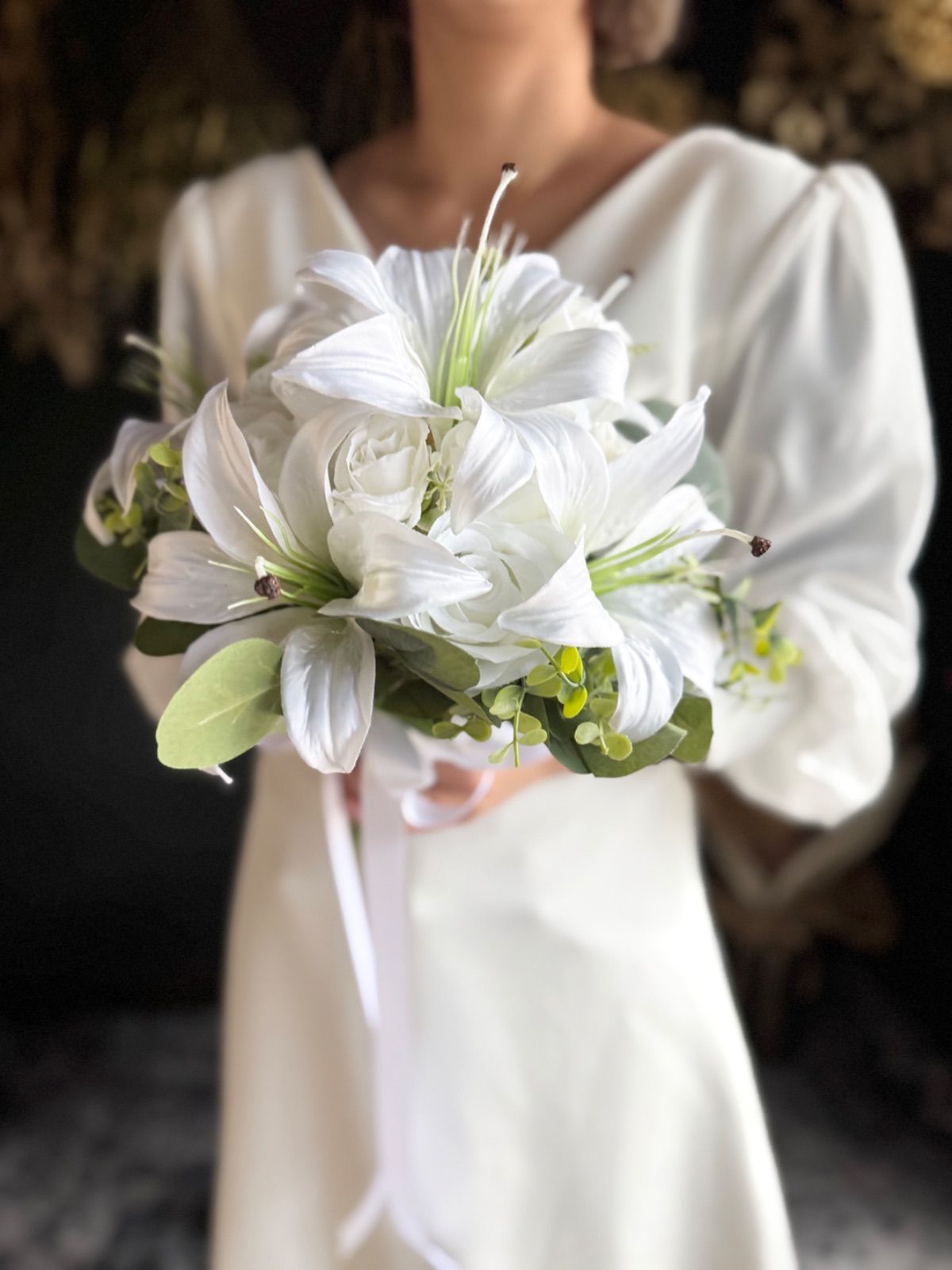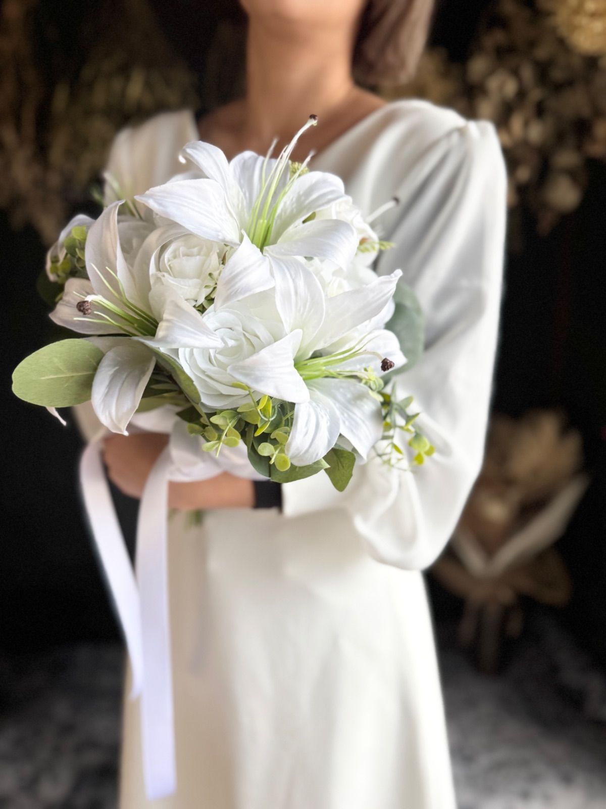 上品な百合とバラを束ねた、清らかで凛とした印象の純白ブーケ•*・