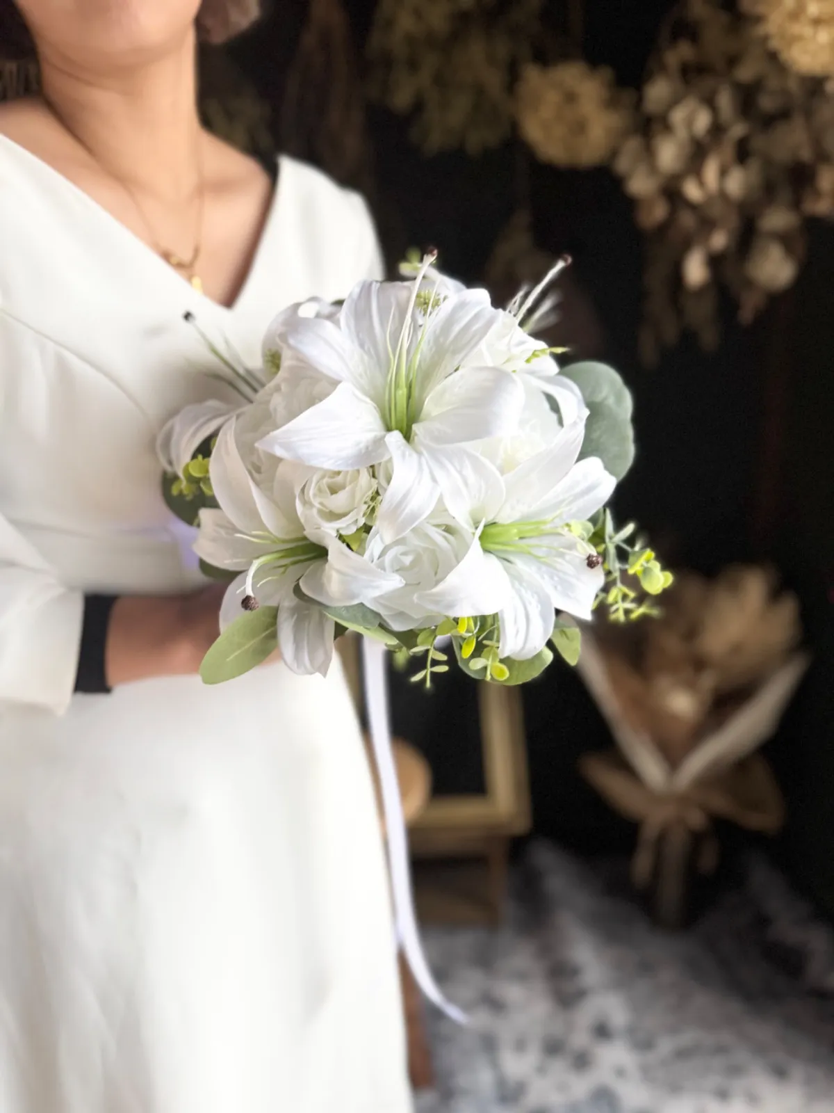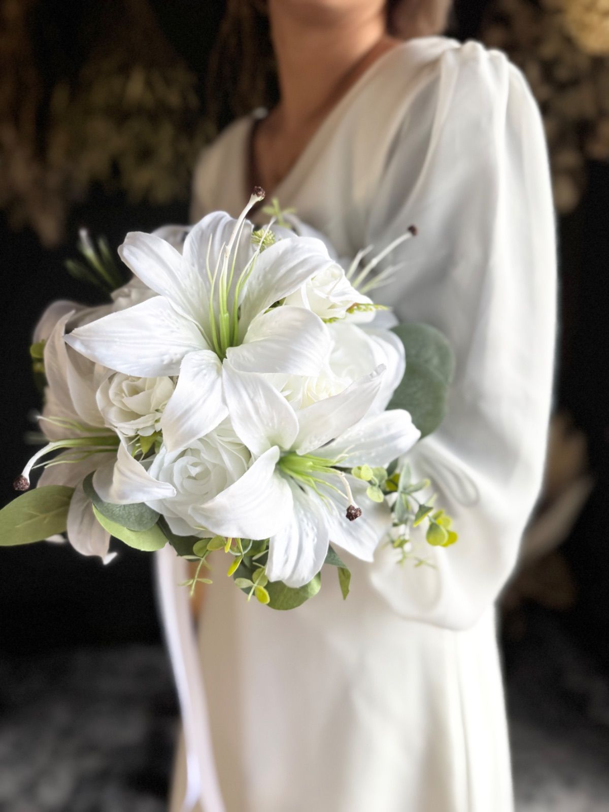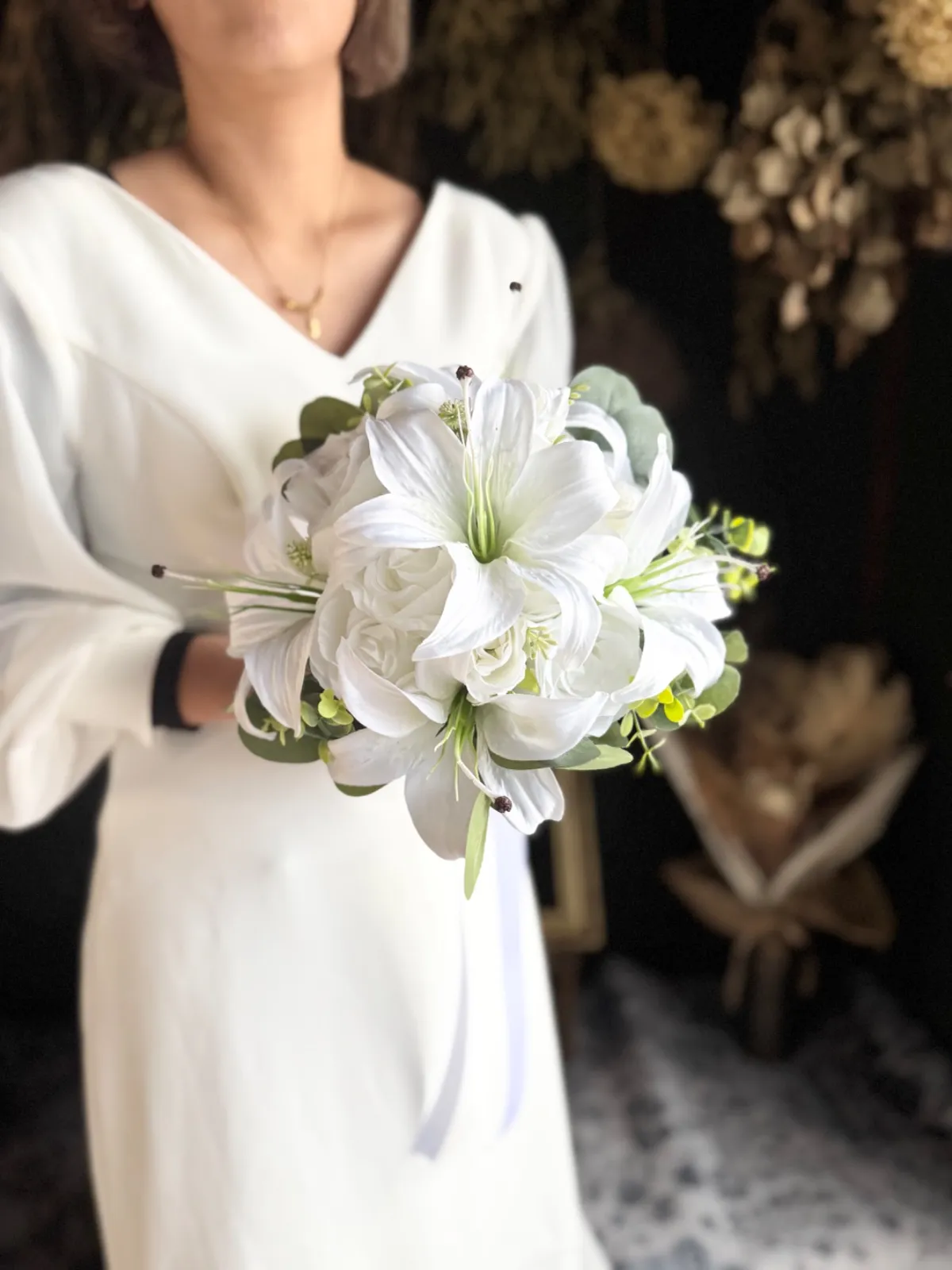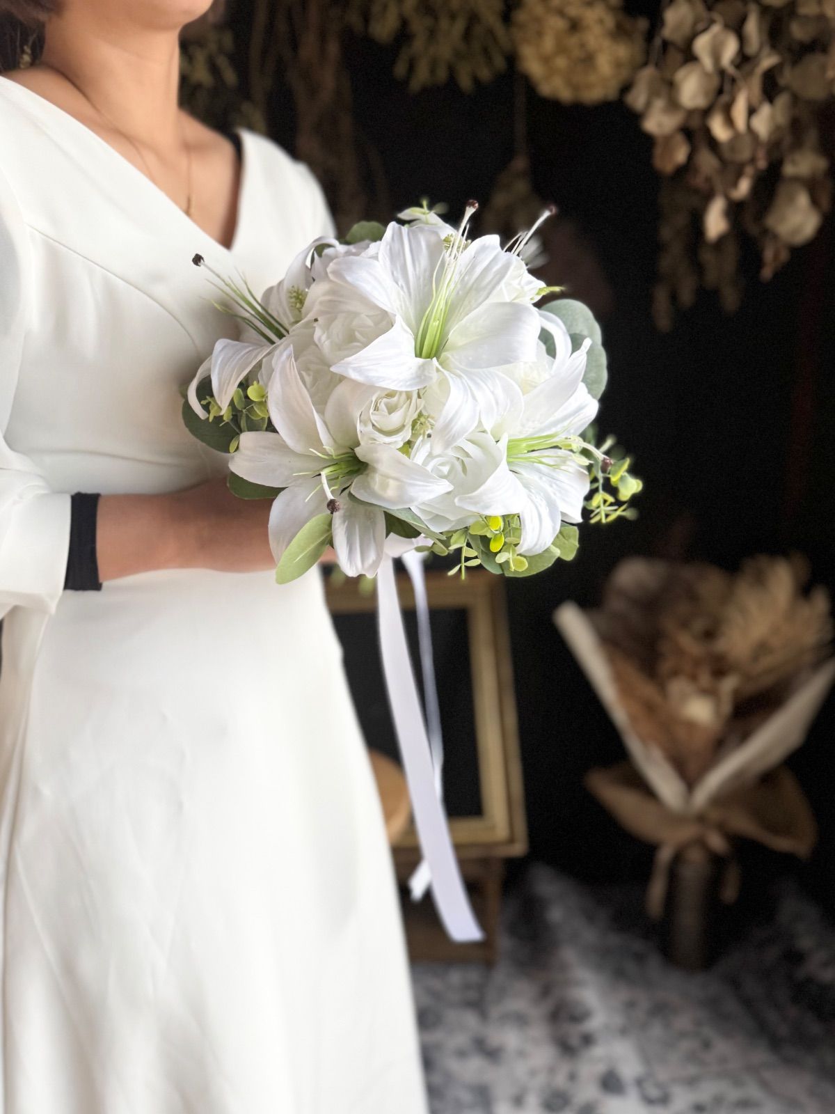 上品な百合とバラを束ねた、清らかで凛とした印象の純白ブーケ•*・