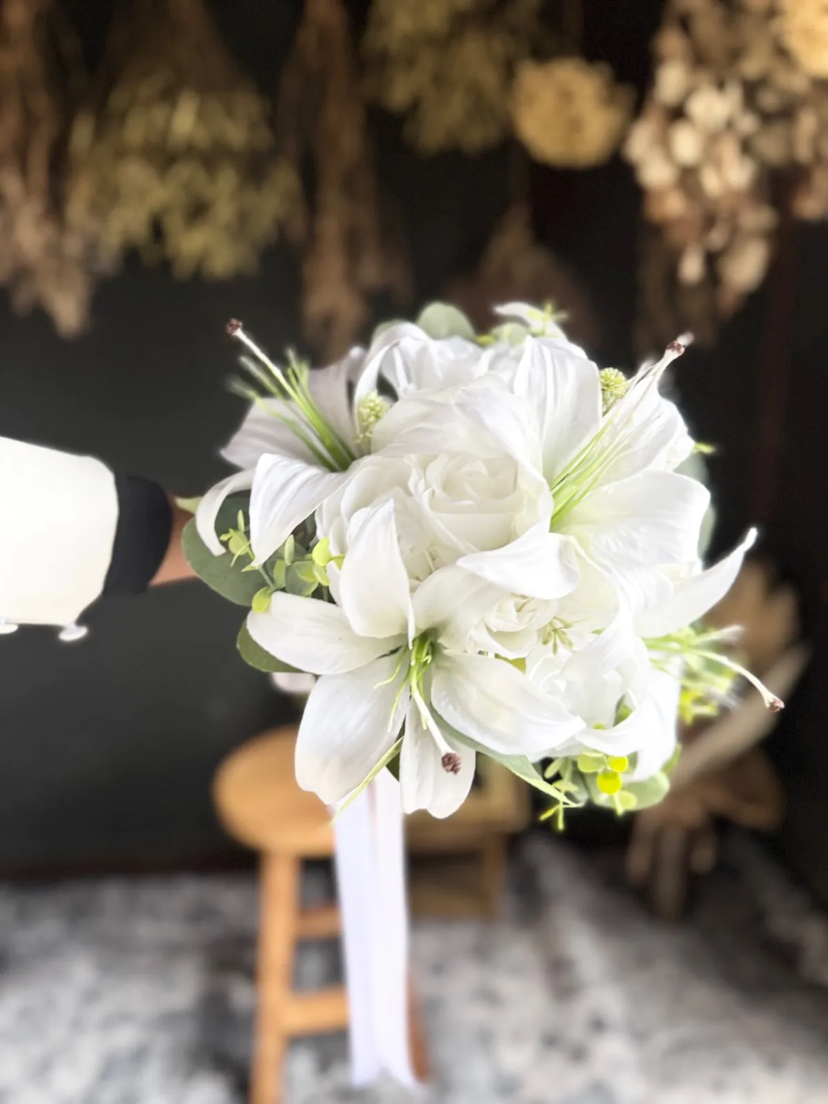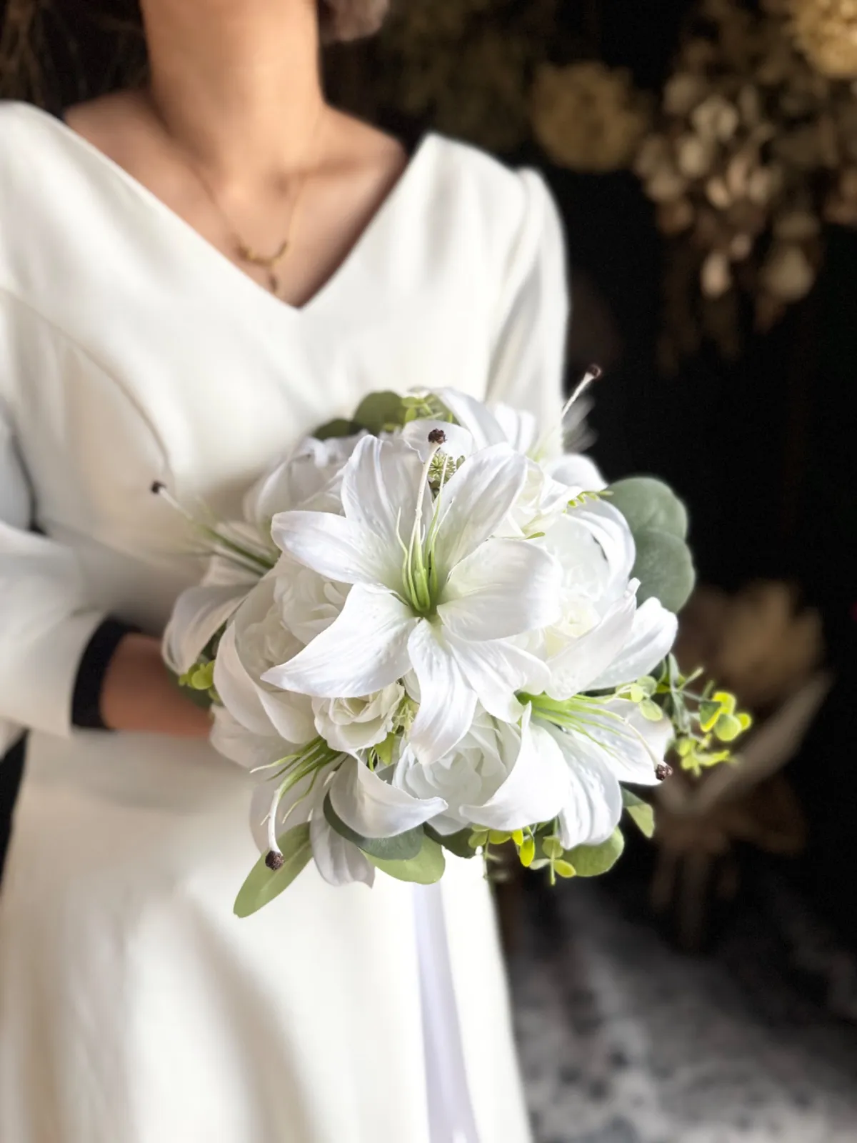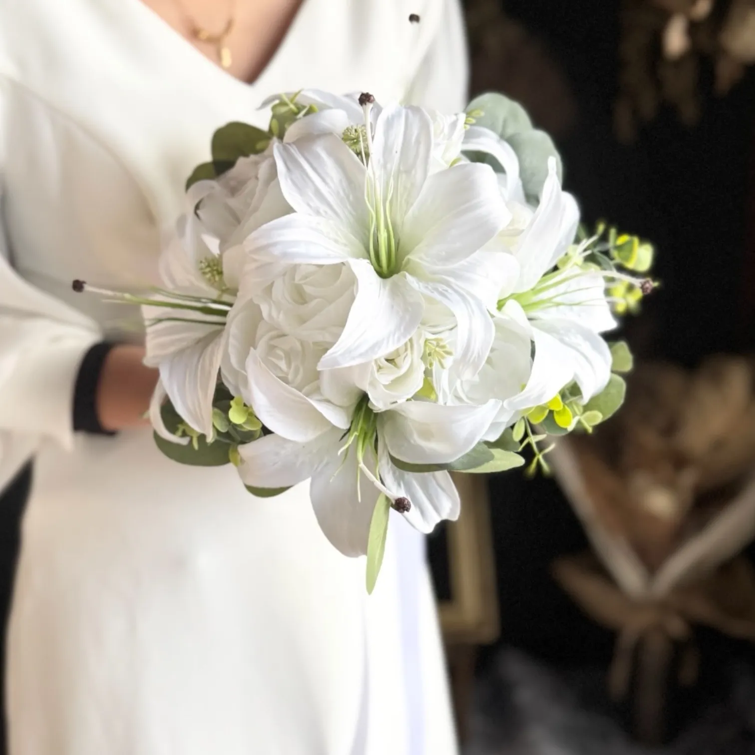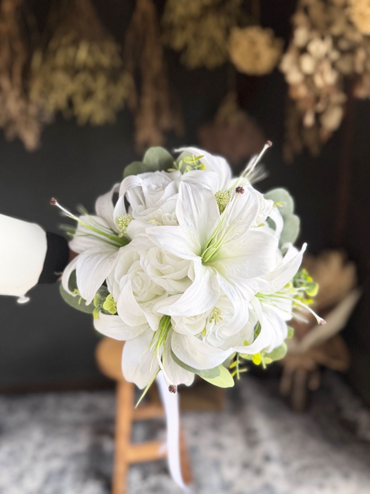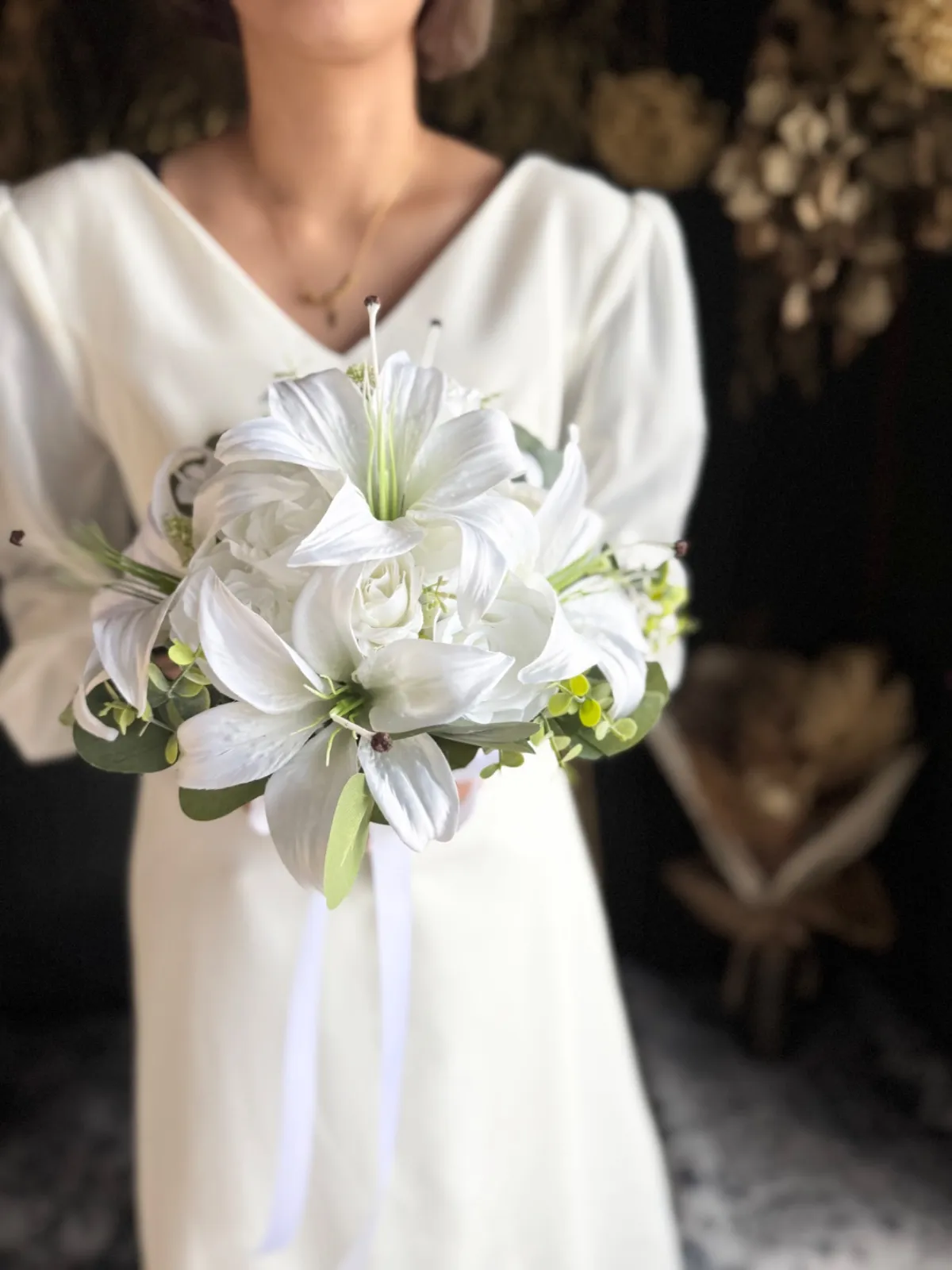 上品な百合とバラを束ねた、清らかで凛とした印象の純白ブーケ•*・