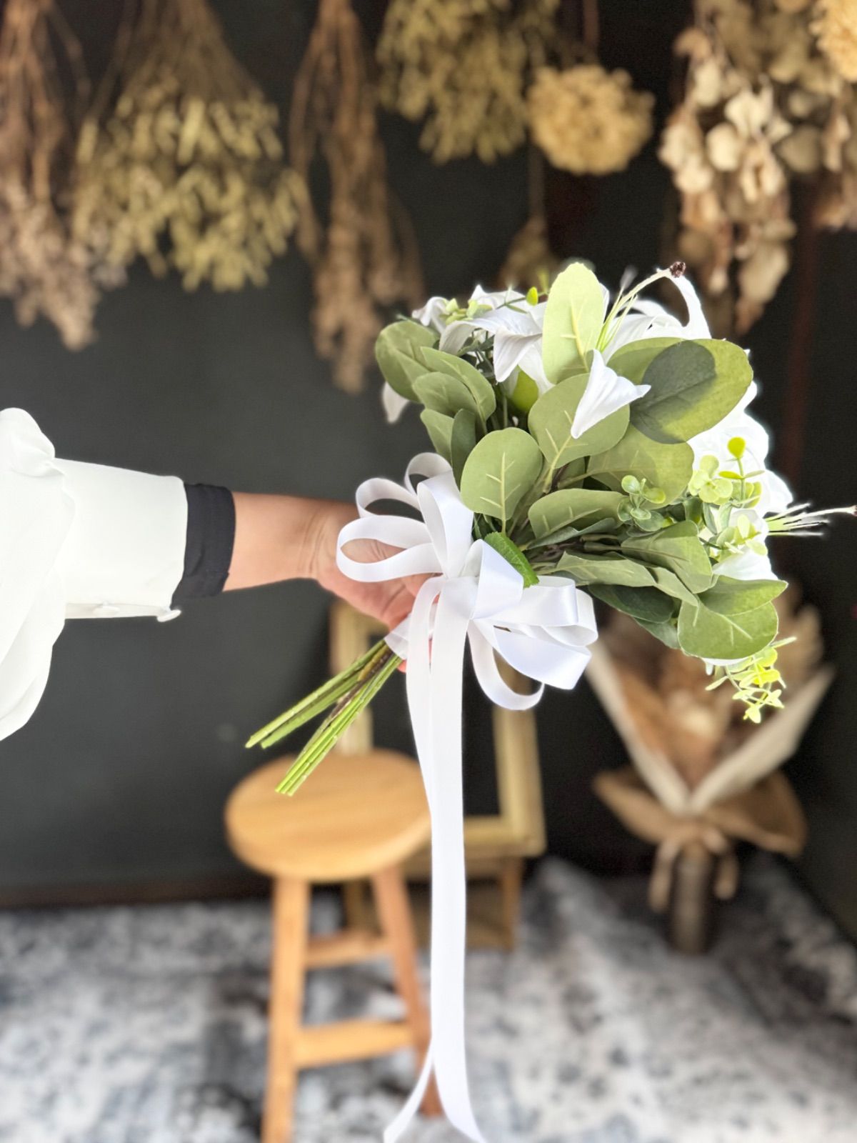グリーンの差し色が優しくナチュラルな雰囲気を演出し、挙式やフォトウェディングにぴったりの一束です•*・