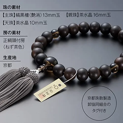 【新品】[仏壇屋 滝田商店] 京念珠 数珠 男性用 縞黒檀 (艶消) 茶水晶仕立 22玉 正絹頭付房 数珠袋付 すべての宗派で使える 証明書付