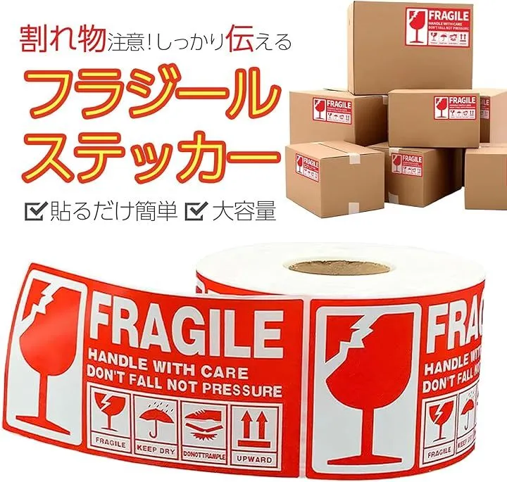 「フラジールステッカーで壊れ物をしっかり警告」フラジールや壊れ物、取り扱い注意の文字とわかりやすいマークを大きく表示したステッカーが、国内外の輸送荷物の安全を守り、配慮ある取り扱いを促します。