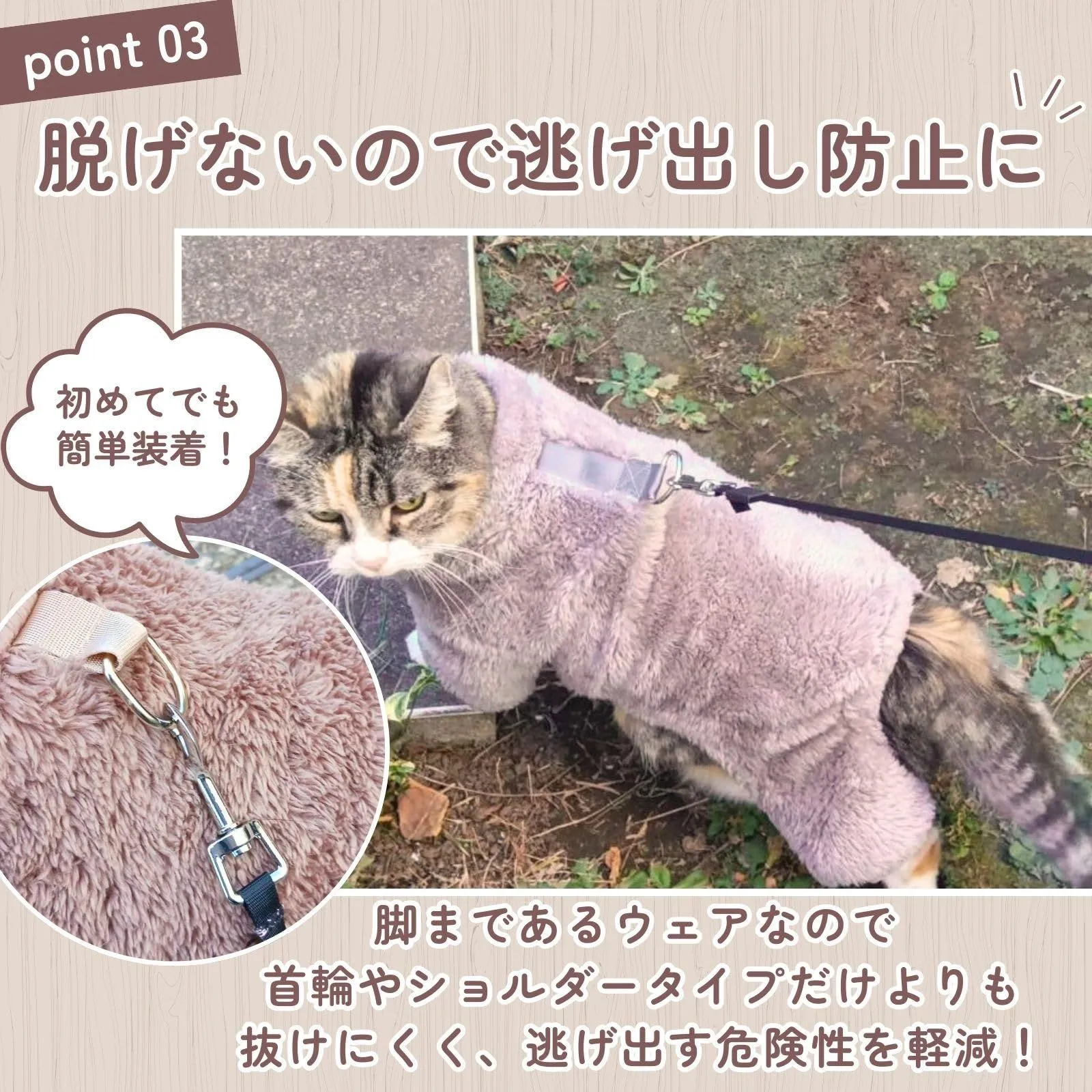 写真の猫はついていません。足までつながった一体型なので猫ちゃんがハーネスから抜け出す心配が少なく、安心してお散歩や外出を楽しめます。