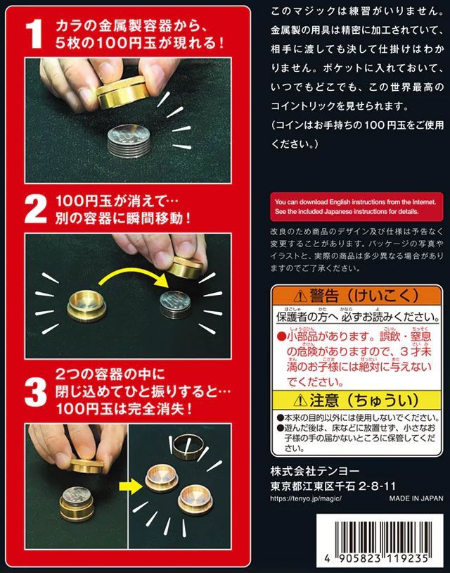 【どんなマジック?】 様々な現象が連続して行える、コインボックス手品の歴史的大傑作です! ・空っぽの容器から5枚の100円玉が出てくる「出現現象」 ・容器から別の容器へと100円玉が移動する「瞬間移動」 ・100円玉が容器を通り抜ける「貫通現象」 ・5枚の100円玉が完全に消えてしまう「消失現象」 これらのマジックが連続手順として行え非常に鮮やか! その様子はプロマジシャンのスーパーテクニックのように見えますが、実は用具の仕掛けにより自動的に行われますので驚くほど簡単にできてしまうのです。 初めてマジックに挑戦する人に強くおすすめしたい素晴らしい名作用具です! ※使用する100円玉は各自ご用意下さい。
