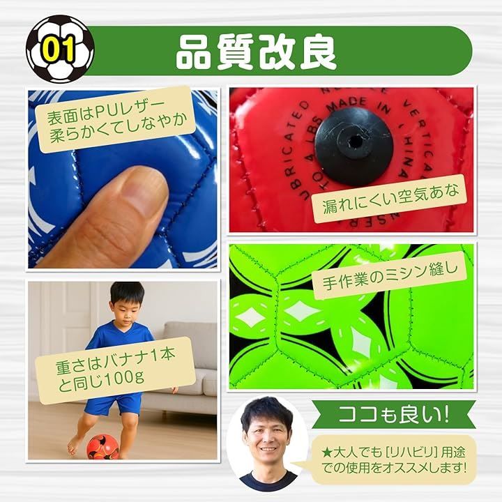 柔らかく軽いPUレザー素材を採用しており、小さなお子さまでも扱いやすく、蹴ったりキャッチしたりする動作がスムーズに行えます。