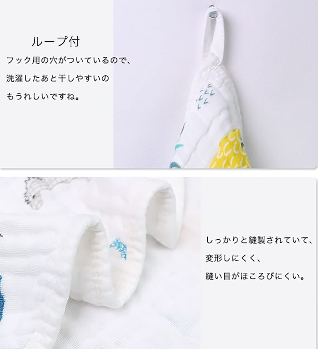 【季節】フック用の穴がついているので、洗濯したあと干しやすいのもうれしいですね。見た目の可愛さだけではなく、優しい肌触りの6重ガーゼは通気性も良く、1年中気持ち良く使うことができますよ。