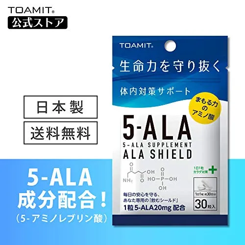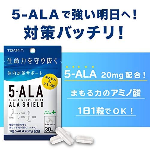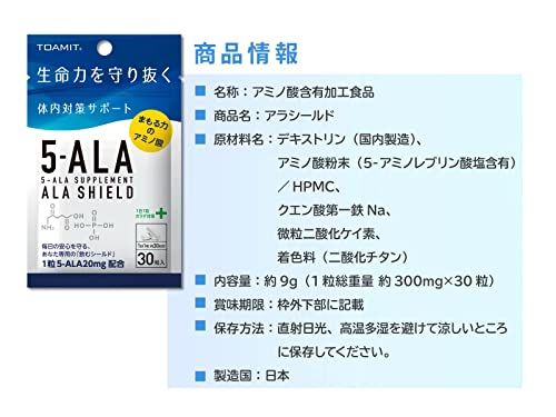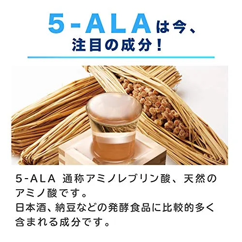 【5-ALAとは】 体内に存在するアミノ酸の一種で、日本酒や納豆などの発酵食品に比較的多く含まれております 5-alaは5-アミノレブリン酸の通称で、天然のアミノ酸です。 5-ALA配合のサプリメントは、 ニュースや情報番組でも取り上げられて話題になるなど、 世間から大注目を浴びている大人気の成分です。 ご使用方法 栄養補助食品として、1日1粒を目安に、お水などと一緒にお召し上がりください。 素材・成分 ・でんぷん(国内製造) ・アミノ酸粉末(5-アミノレブリン酸塩含有) ・HPMC ・クエン酸第一鉄Na ・微粒二酸化ケイ素 ・着色料(二酸化チタン) 内容量 約10g(1粒総重量約333mg×30粒) 注意事項 ・薬を服用中の方、あるいは通院中の方は医師にご相談の上、お召し上がりください。 ・妊娠・授乳中の方は摂取をお避けください。 ・食物アレルギーのある方は原材料をご確認の上、お召し上がりください