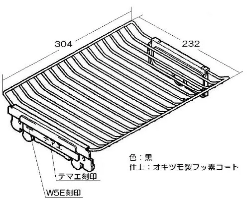◆ フッ素が剥がれる可能性がございますので、下記の点にご注意下さい。 ◎オプション品の「魚とって」は、こちらの焼き網にはご使用いただけません。 ◎お手入れの際、下記のお手入れグッズは絶対にしないで下さい。 ・ナイロンスポンジ、ナイロンタワシ ・スチールタワシ ・硬いブラシ、タワシ ・アルカリ性洗剤、クレンザー ・酸性洗剤 ・漂白剤 「主な仕様」リンナイ
