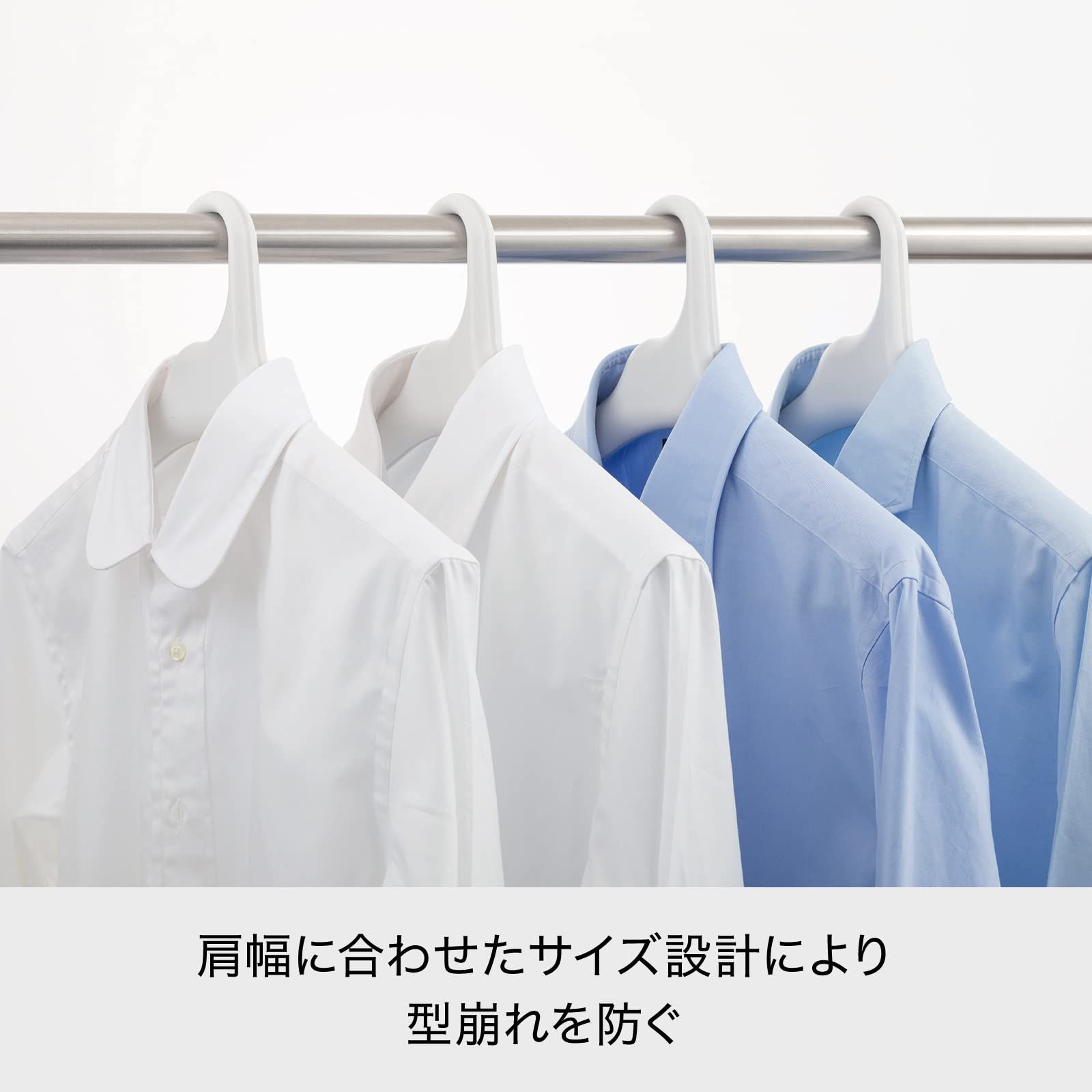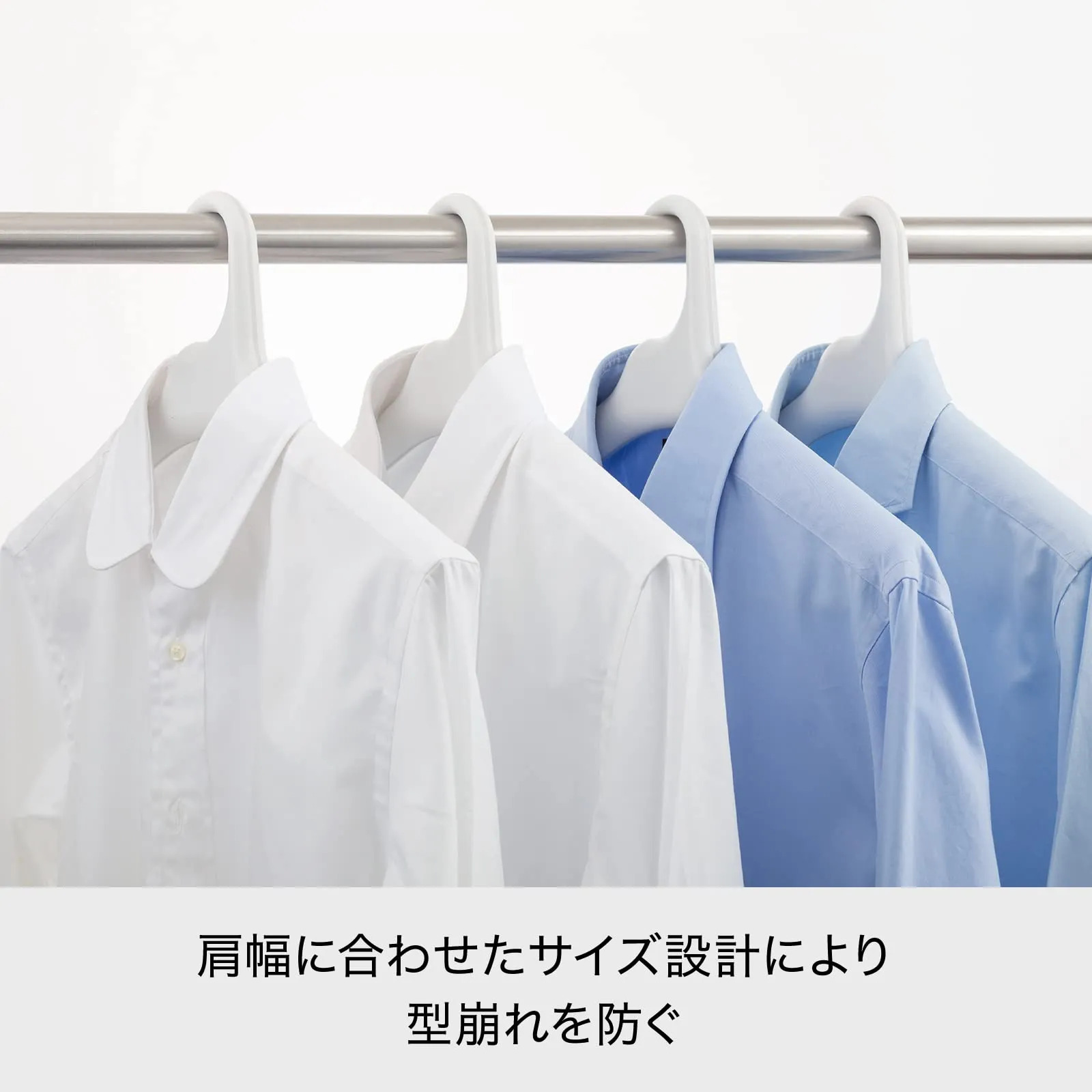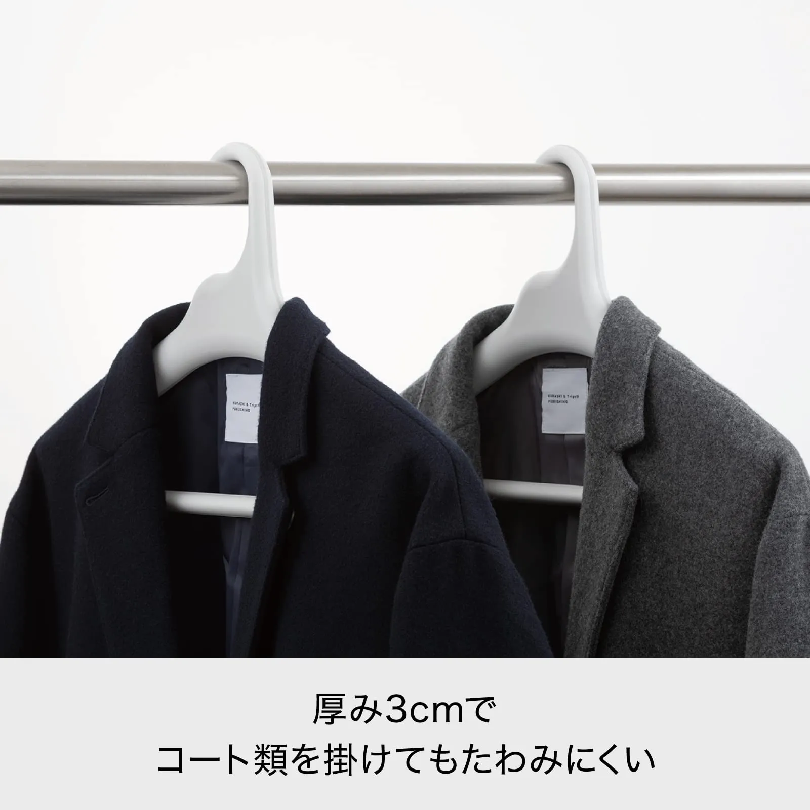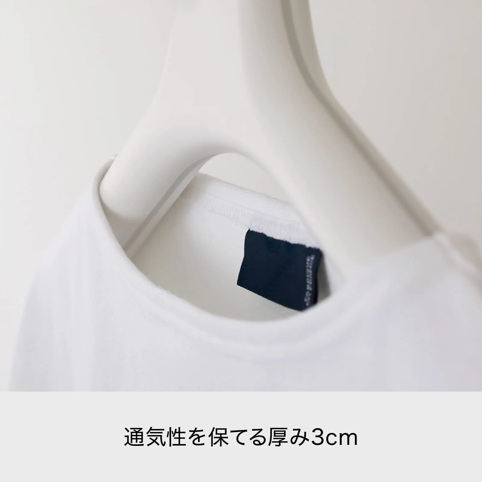 本体サイズ:約W42xD3xH24cm重量:約195g/1ヶあたり材質:本体/スチロール樹脂、中板/熱可塑性エラストマー厚さ約3cmで通気性が良く、スチームアイロンをかけるのにも便利滑り止めが付いている為、洋服が滑り落ちない丸みがあり、襟も立つ形状の為、シャツが型崩れしないループフックがついている為、スカートやキャミソールが掛けられる