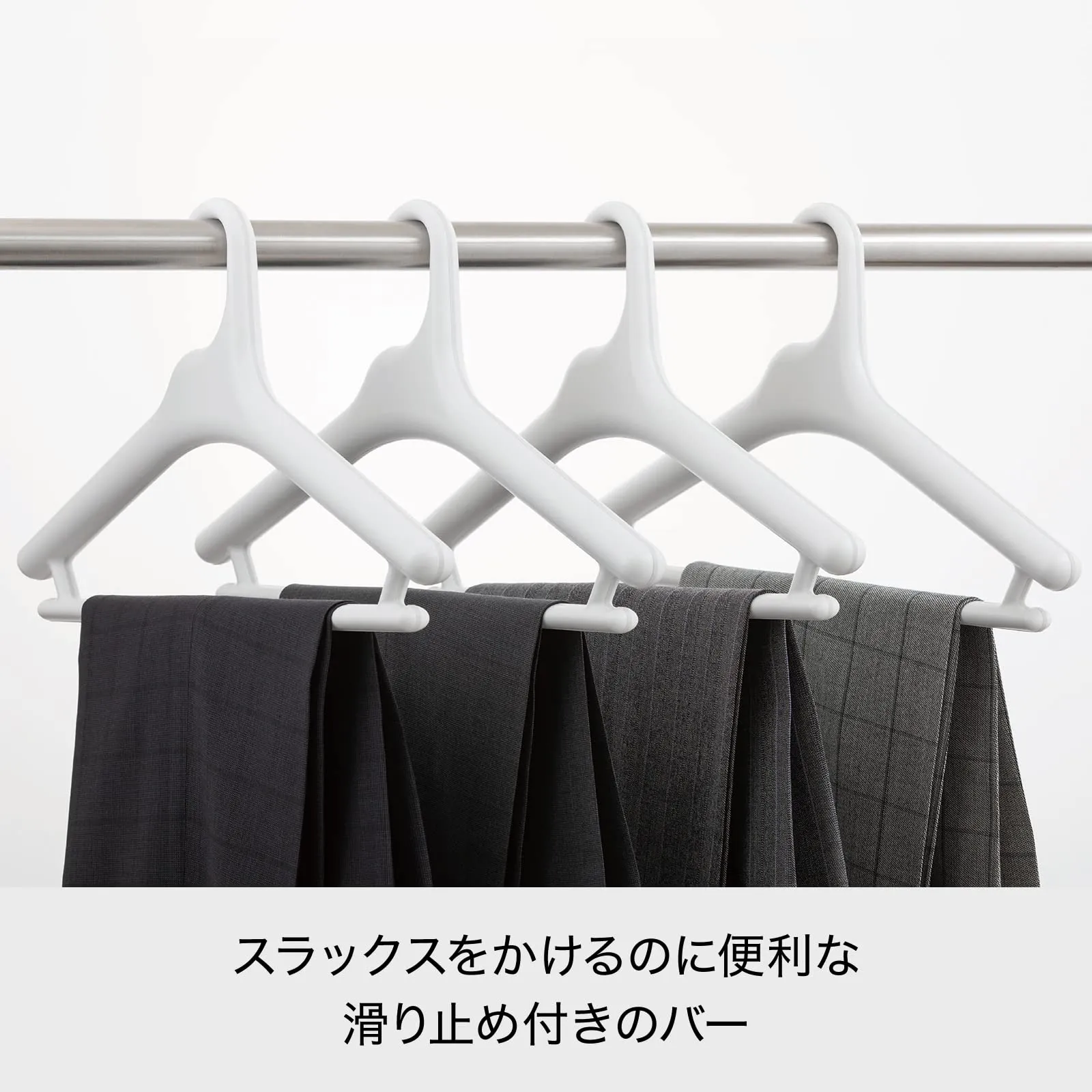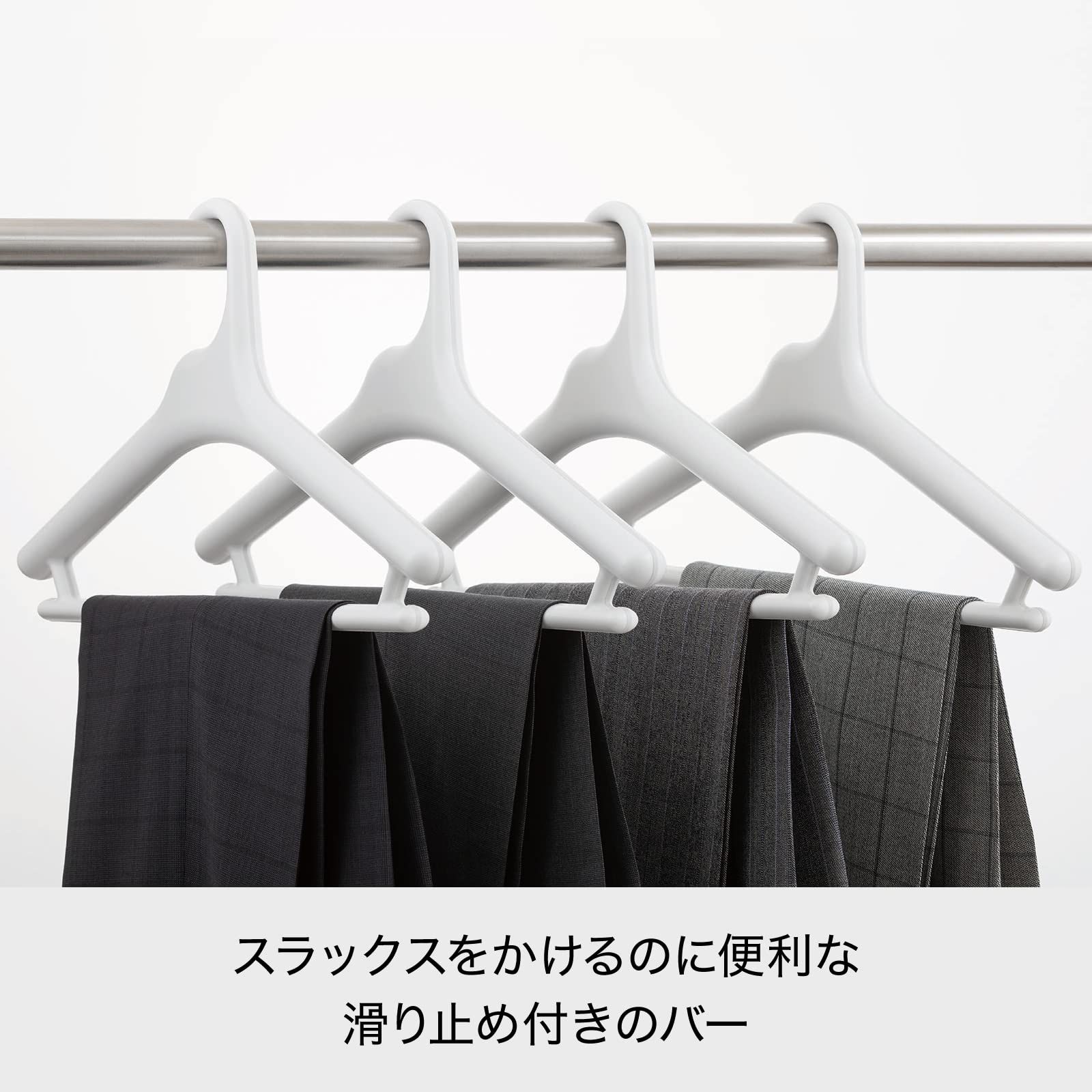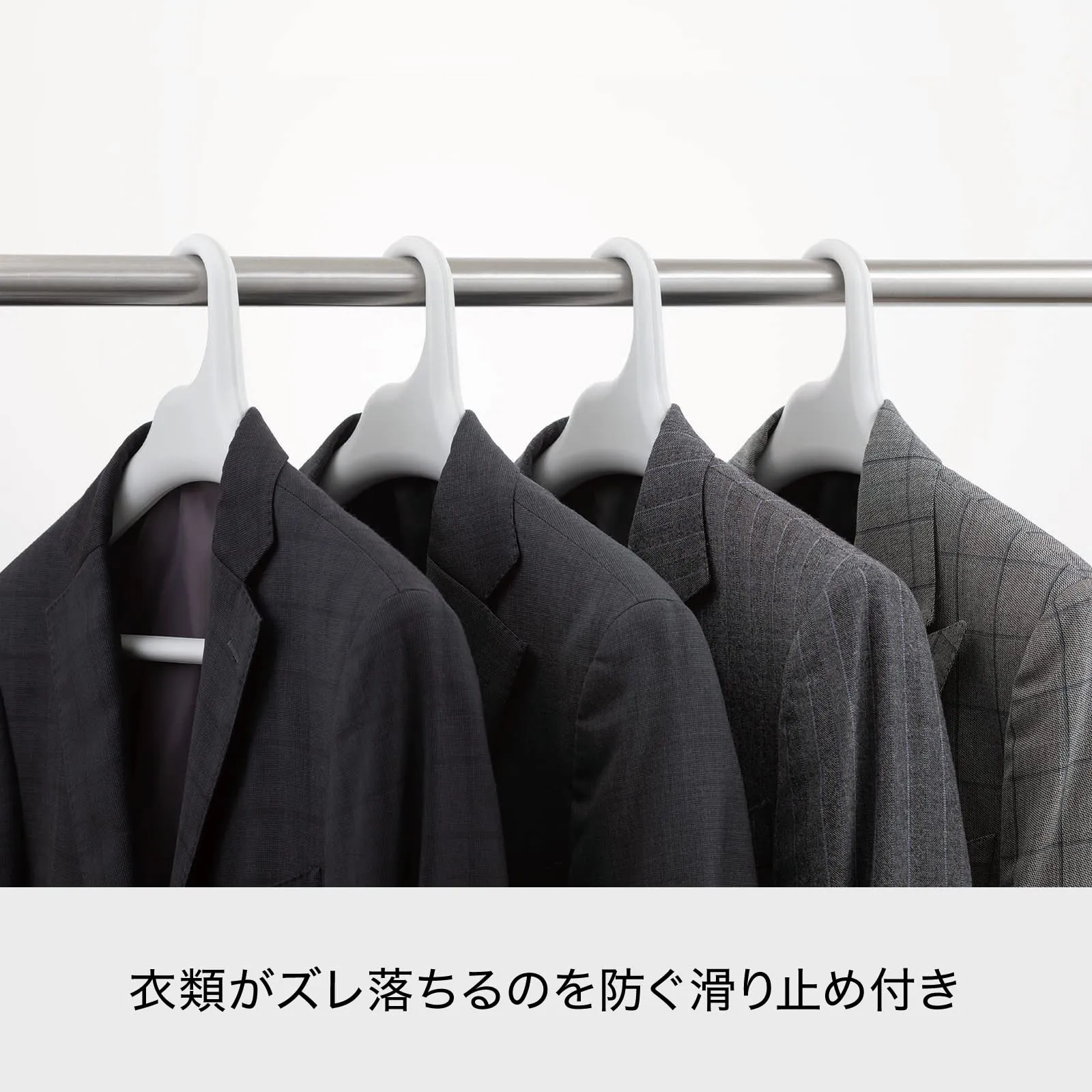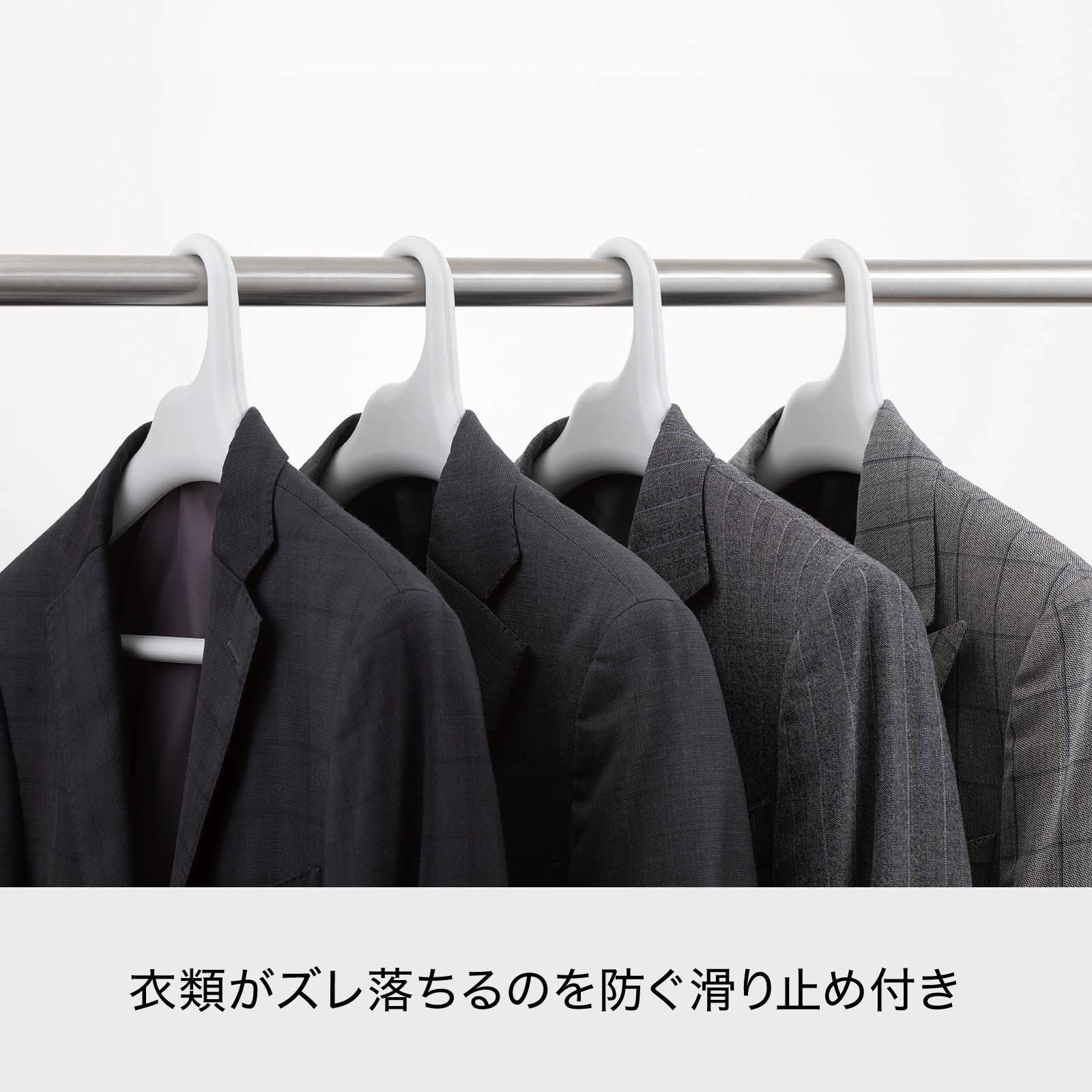 本体サイズ:約W42xD3xH24cm重量:約195g/1ヶあたり材質:本体/スチロール樹脂、中板/熱可塑性エラストマー厚さ約3cmで通気性が良く、スチームアイロンをかけるのにも便利滑り止めが付いている為、洋服が滑り落ちない丸みがあり、襟も立つ形状の為、シャツが型崩れしないループフックがついている為、スカートやキャミソールが掛けられる