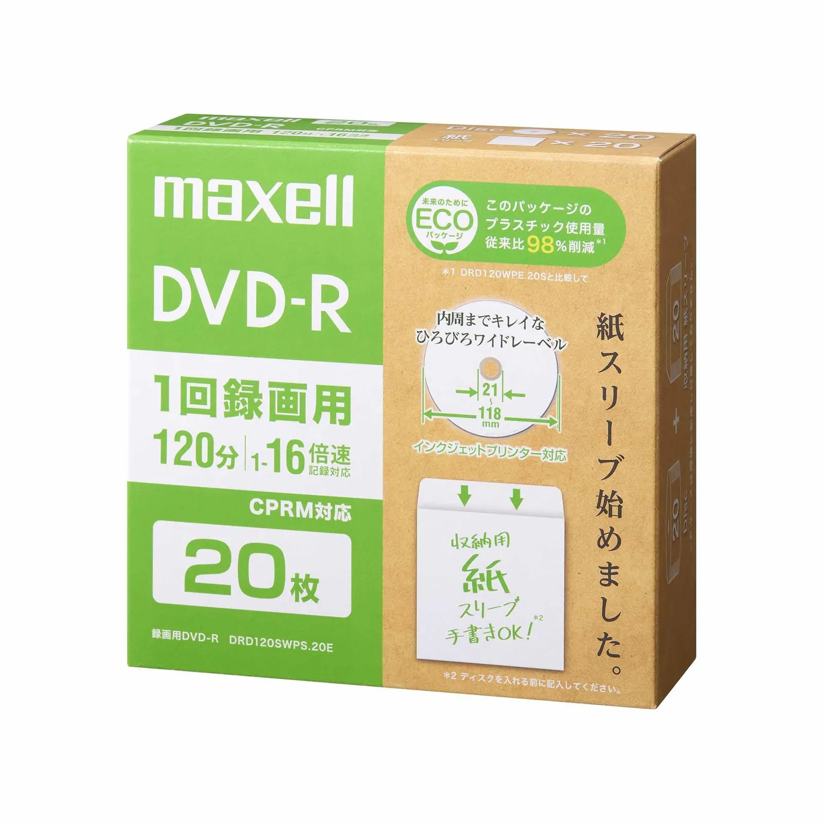 マクセル(Maxell) 録画用DVD-R エコパッケージ ひろびろワイドレーベル (1~16倍速 CPRM対応) DRD120SWPS.20E [20枚]
