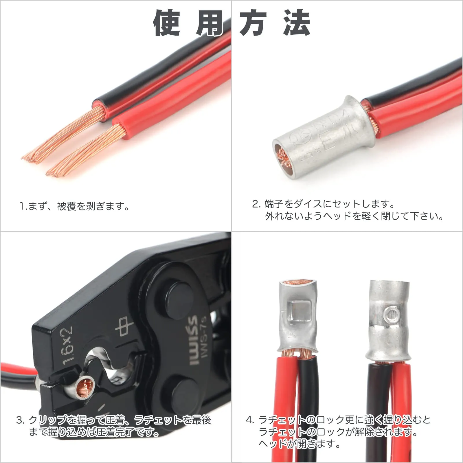 ※新品の場合、圧着工具(新品)のハンドル動作(リングやピン)がかたいことは正常です。しばらくお使いいただくことで少しずつなじみ、軽くなります。