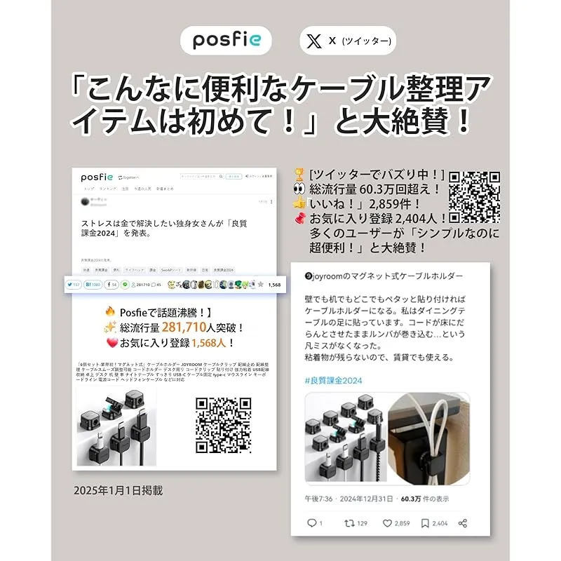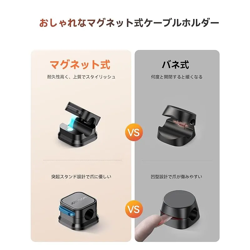 【業界初の革命!マグネット式・片手操作!】JOYROOMのケーブルホルダーは独特なマグネット開閉式ケーブルクリップデザインにより、片手でケーブルを取り付けたり取り外したりすることができます。他のコードホルダーとは異なり、JOYROOMのケーブル クリップは先進的な60 度回転シャフトと磁気ケーブル ロック設計を備えており、ケーブルを簡単に取り外したり、ケーブルを簡単に追加したりできます。 ????